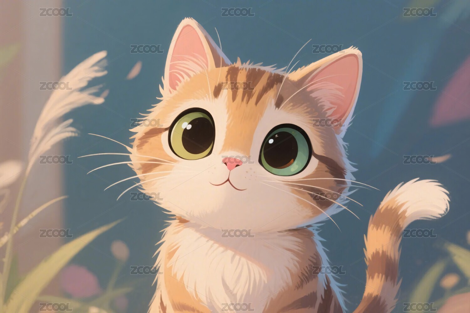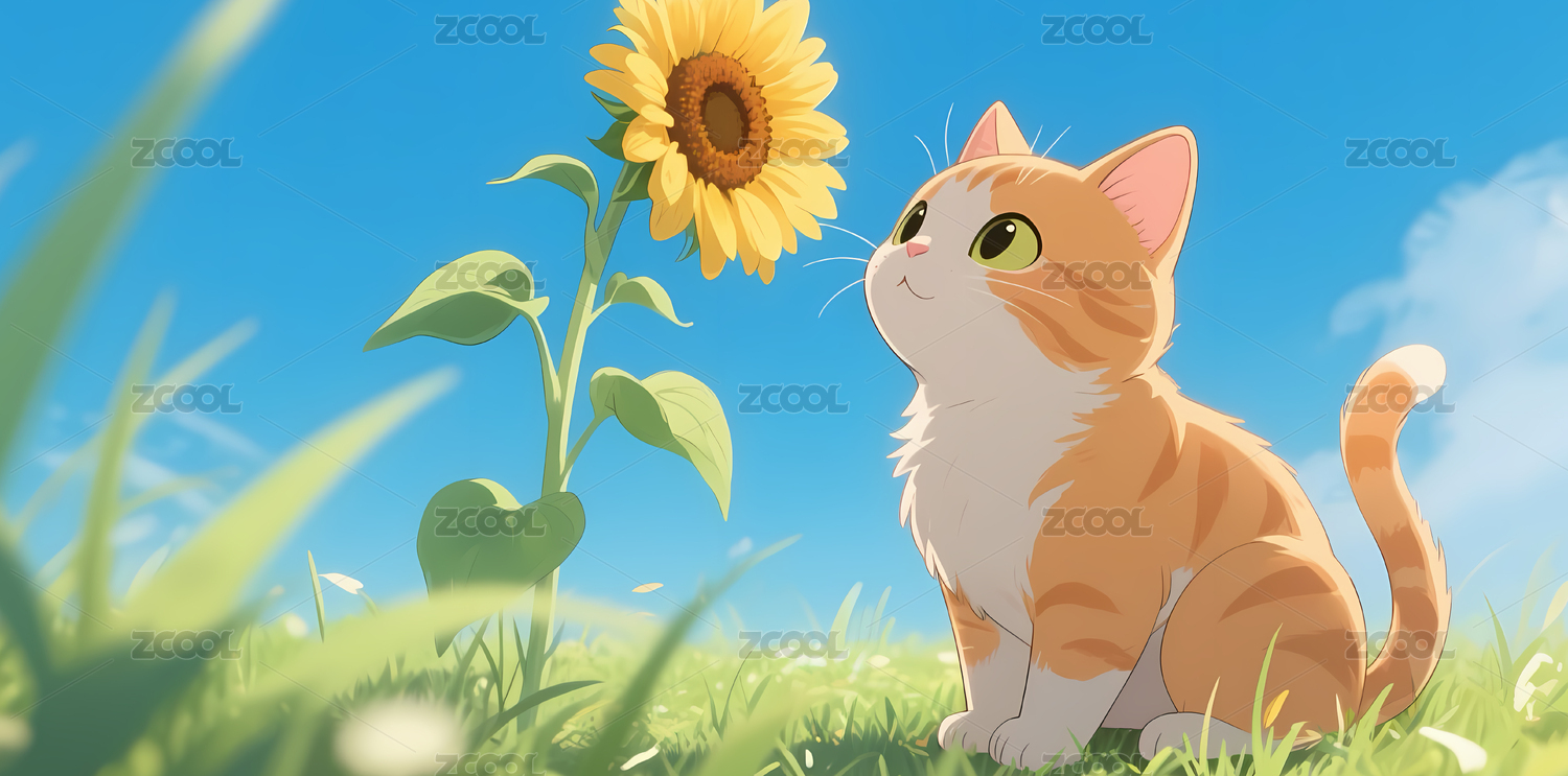 手绘,卡通,夏日,草地,天空,猫,插画,动物,宠物,可爱