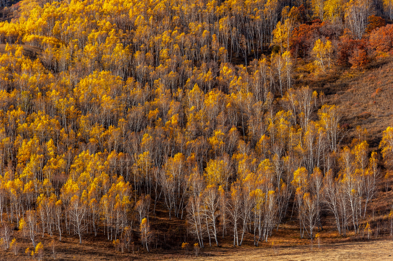 北方乡村山区秋天金黄的树林