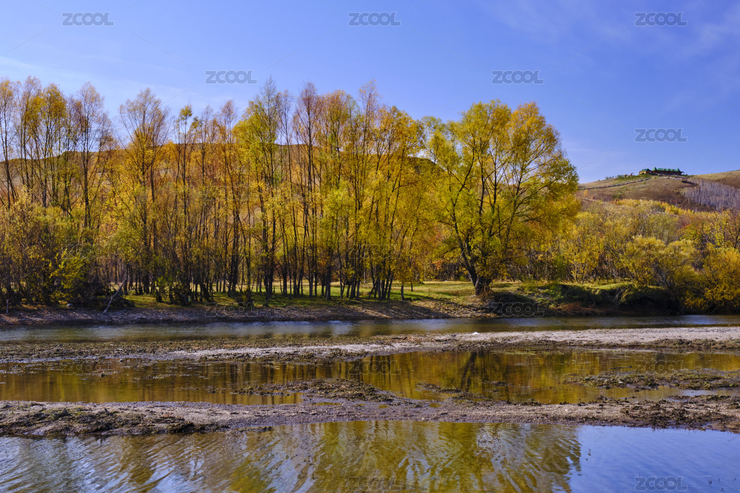 内蒙古阿尔山秋天里的河流和金黄色森林风景