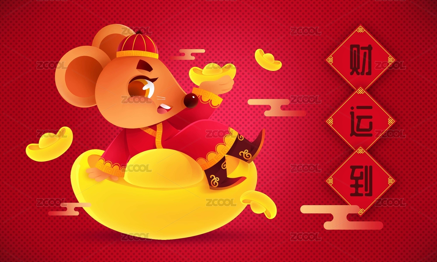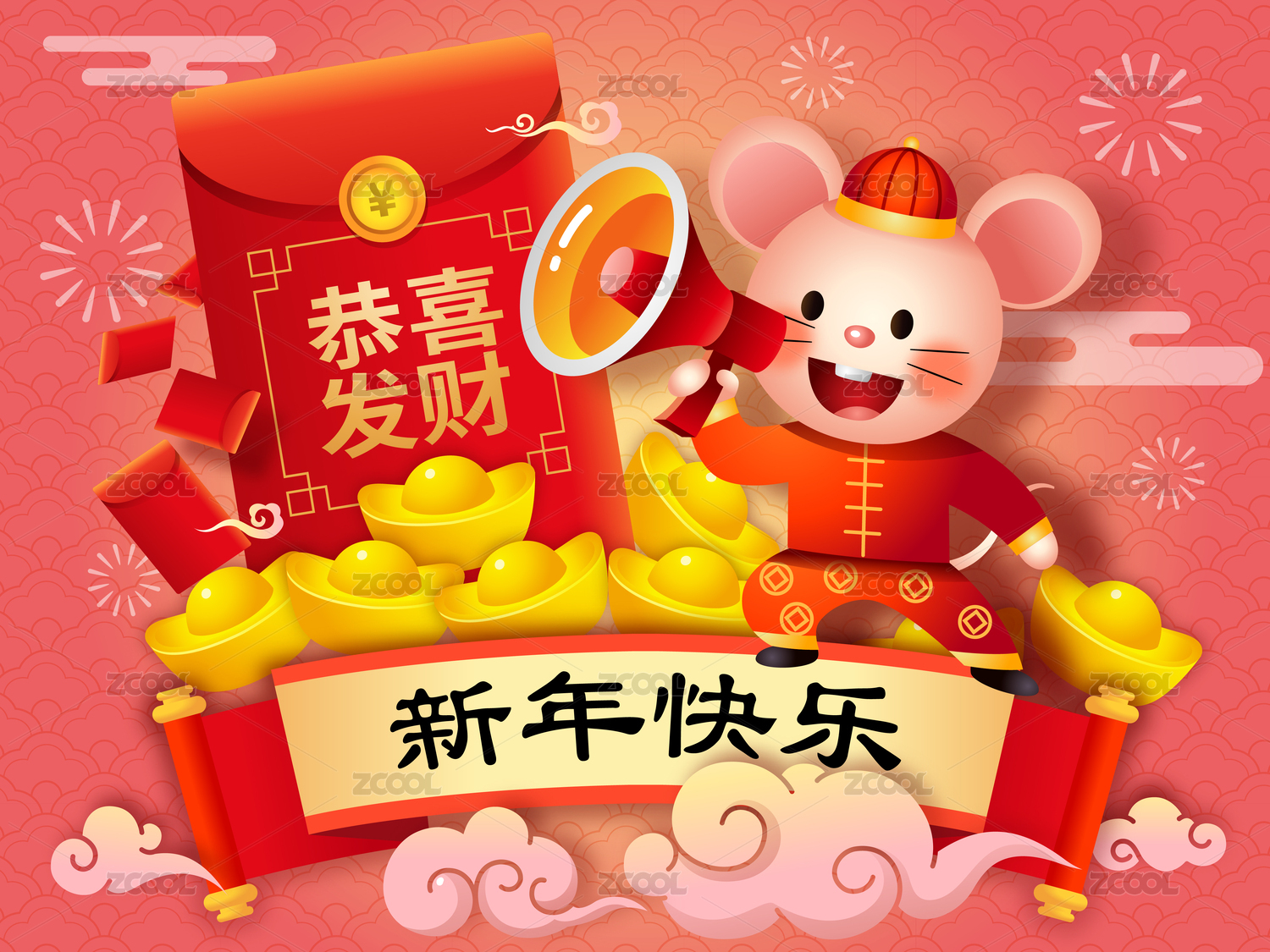 恭喜发财 卡通老鼠与满满金钱金元宝的红包