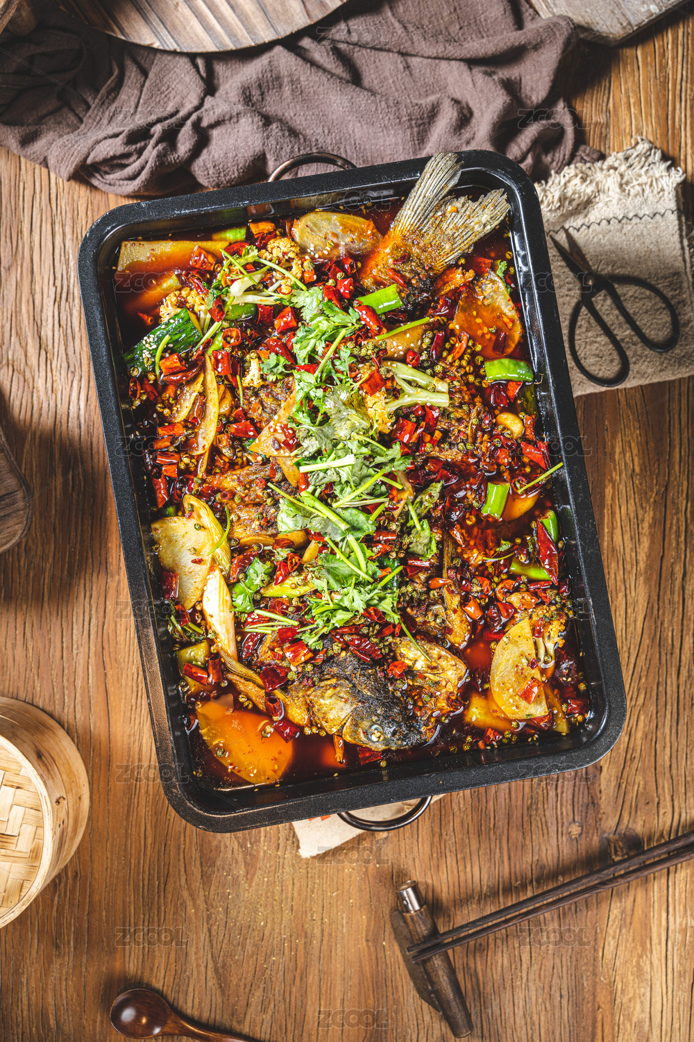 俯拍视角麻辣炭烤鱼,重庆麻辣菜
