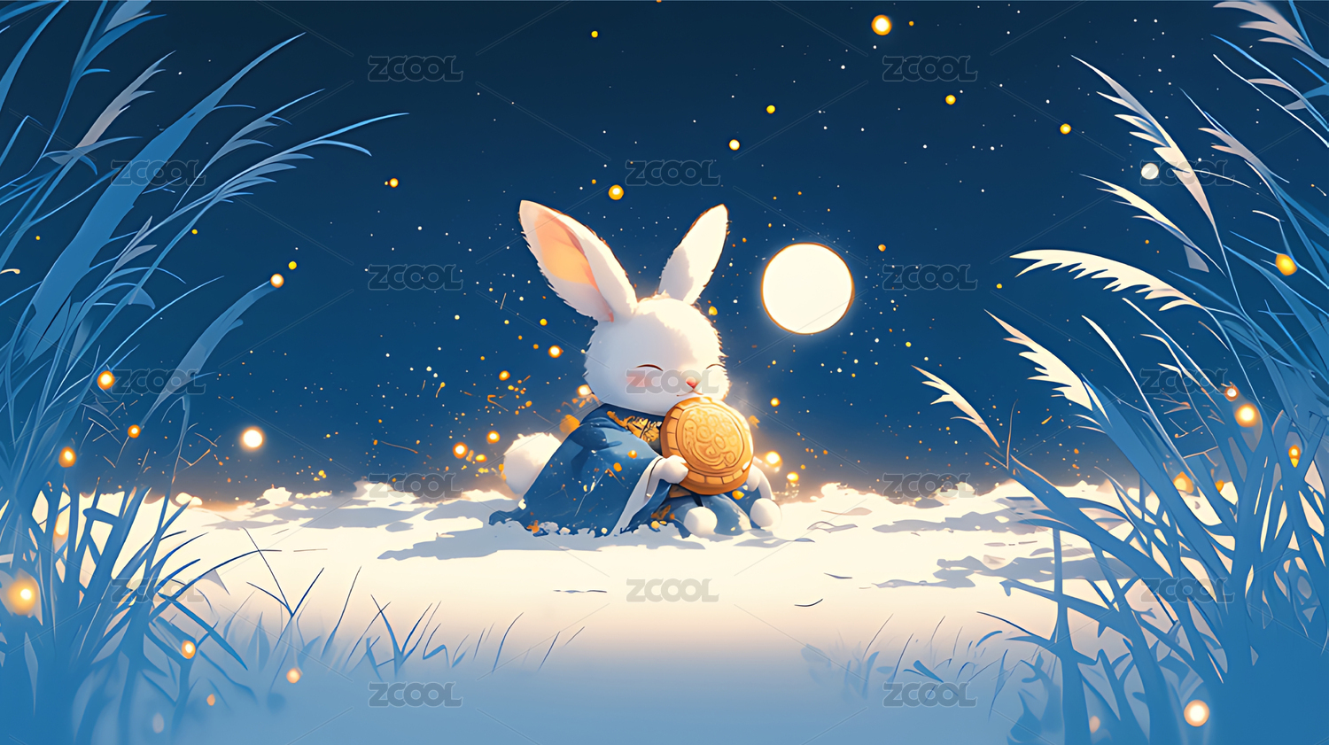 穿汉服的玉兔吃月饼中秋节可爱插画