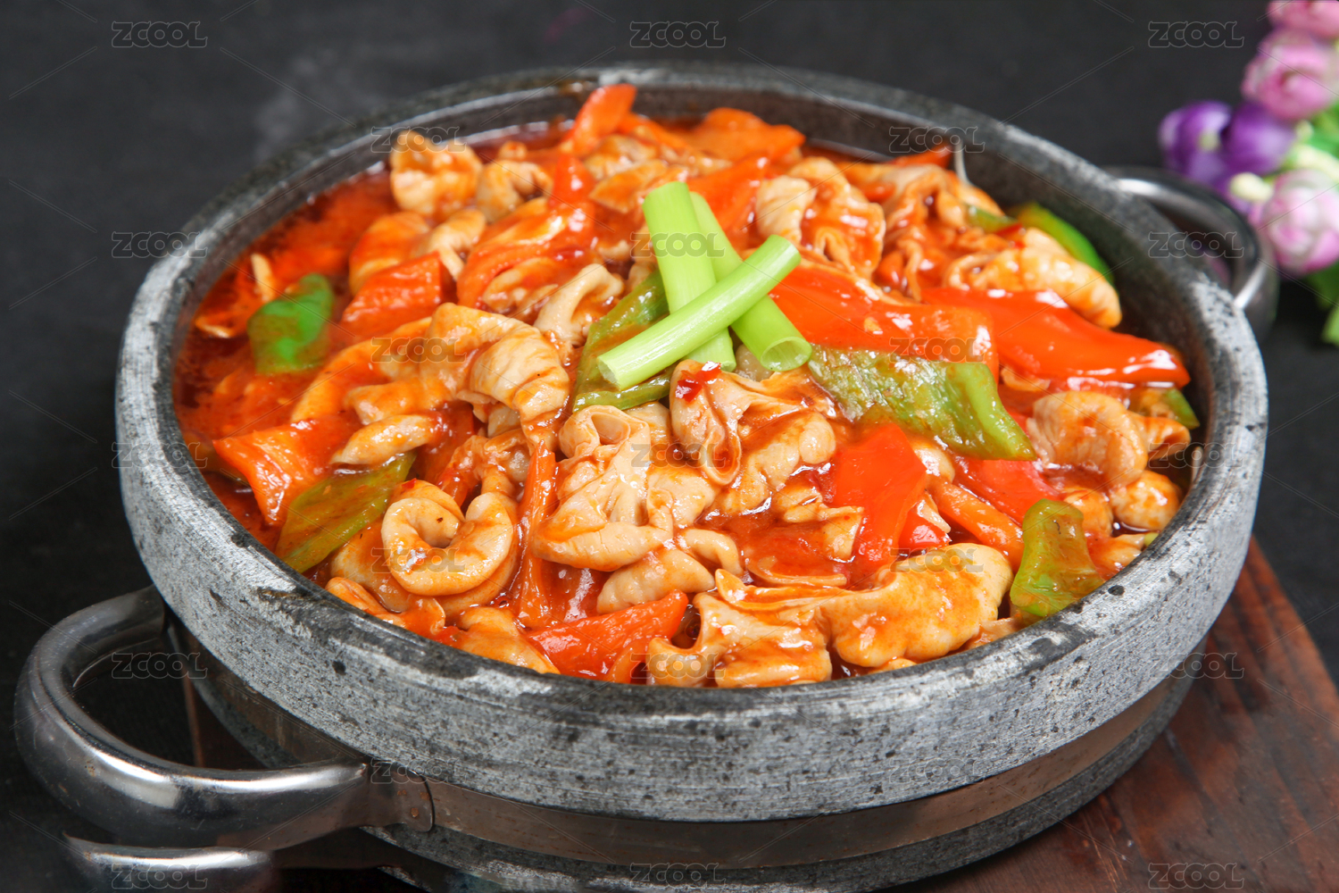 黑色盘形铁锅里的香辣麻辣肥肠干锅