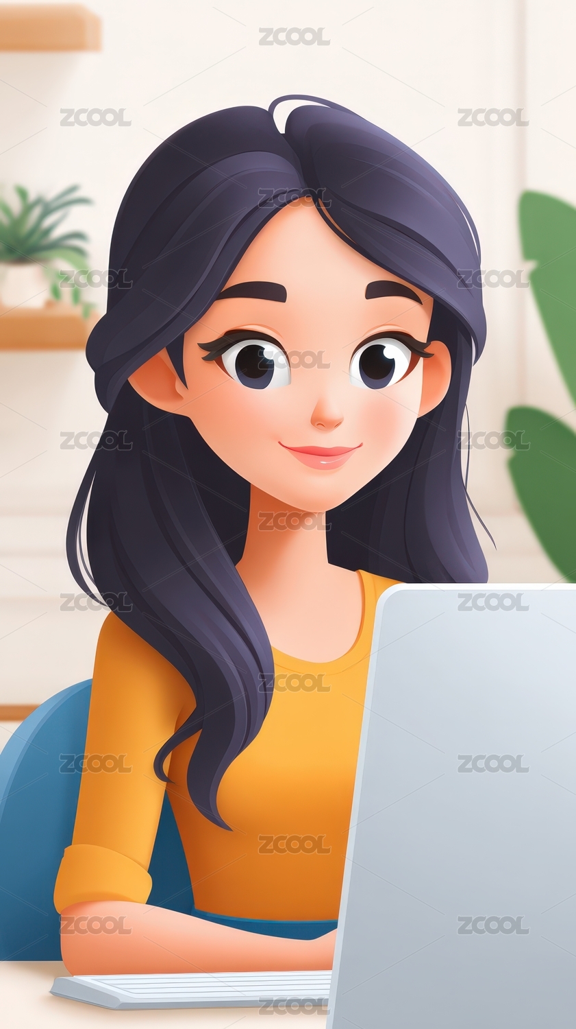女孩,女生,侧面视角,工作,电脑,台灯,盆栽,窗户,短袖,室内