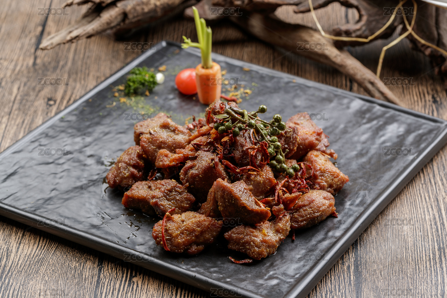 方形瓷盘装的孜然羊肉摆放在樟木砧板上