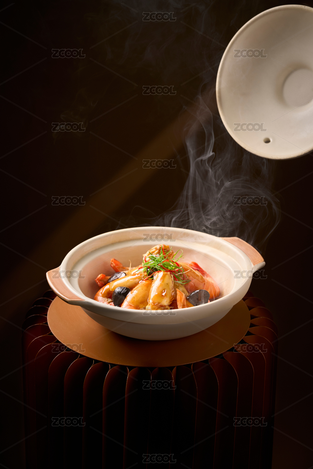 棕色木纹桌面上放着一盘招牌佛跳墙