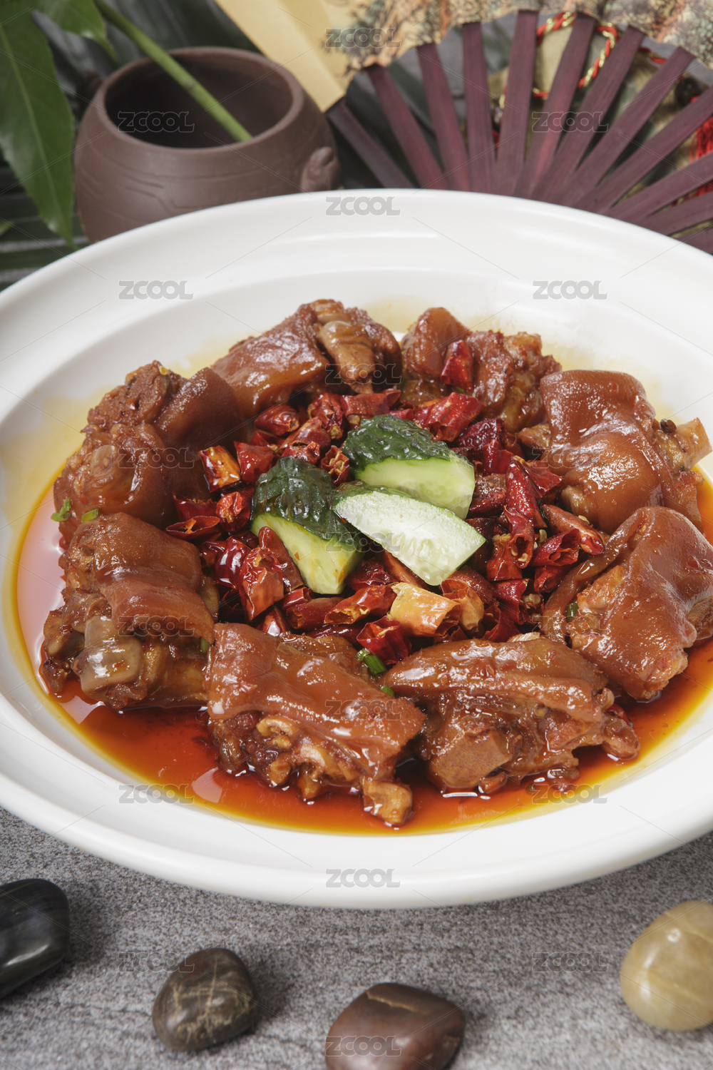白色圆盘装的香辣猪蹄摆放在白色背景上