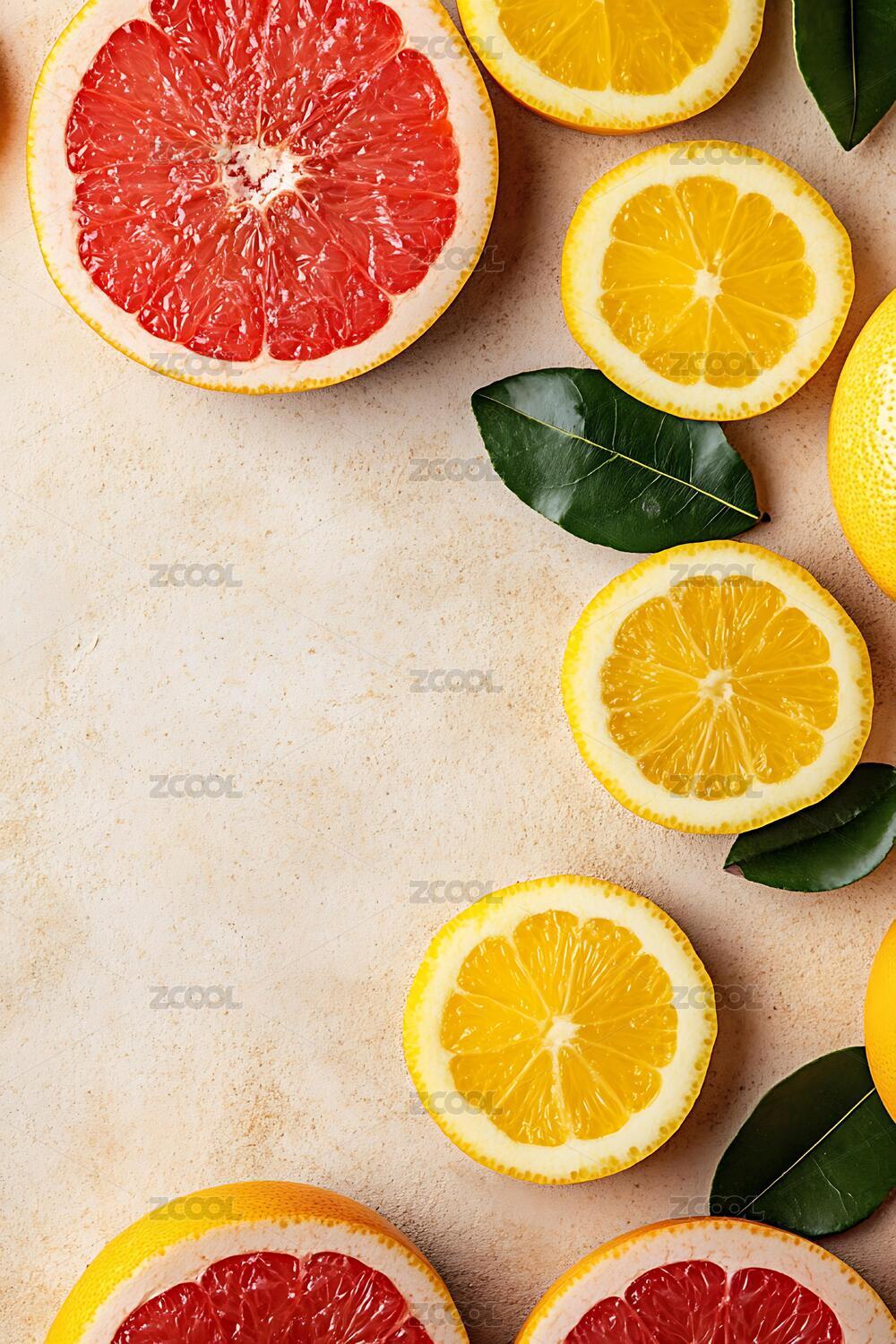 新鲜的葡萄柚和柠檬切片摆放在米色背景上
