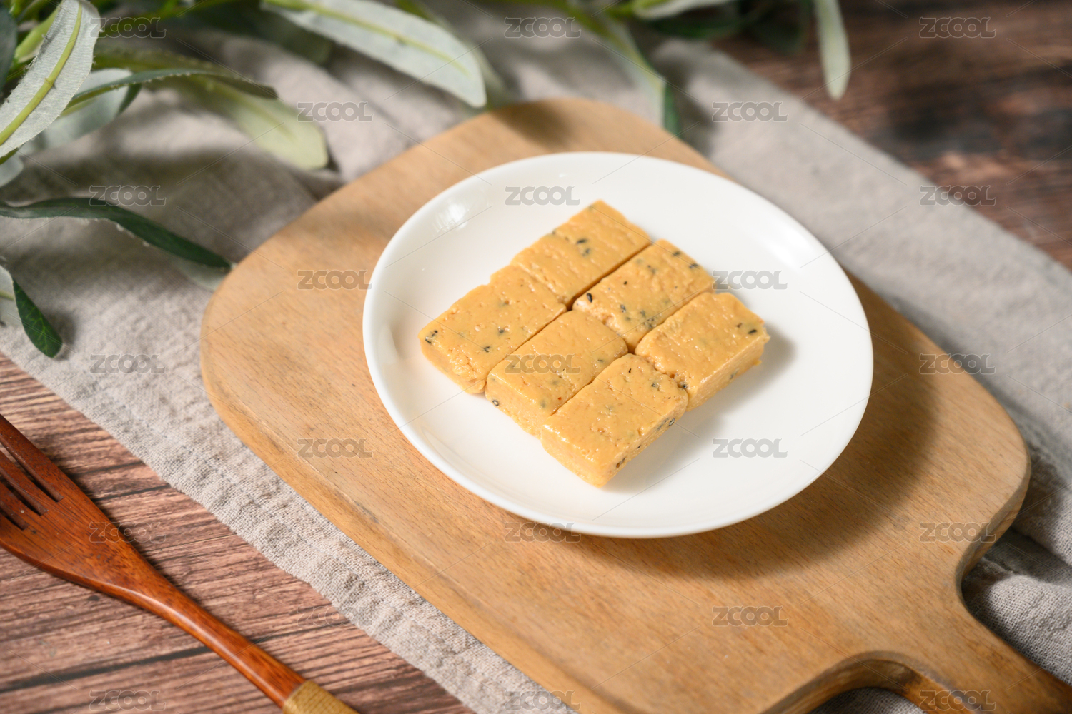 桌面上的盘子里的美味可口的抹茶雪花酥