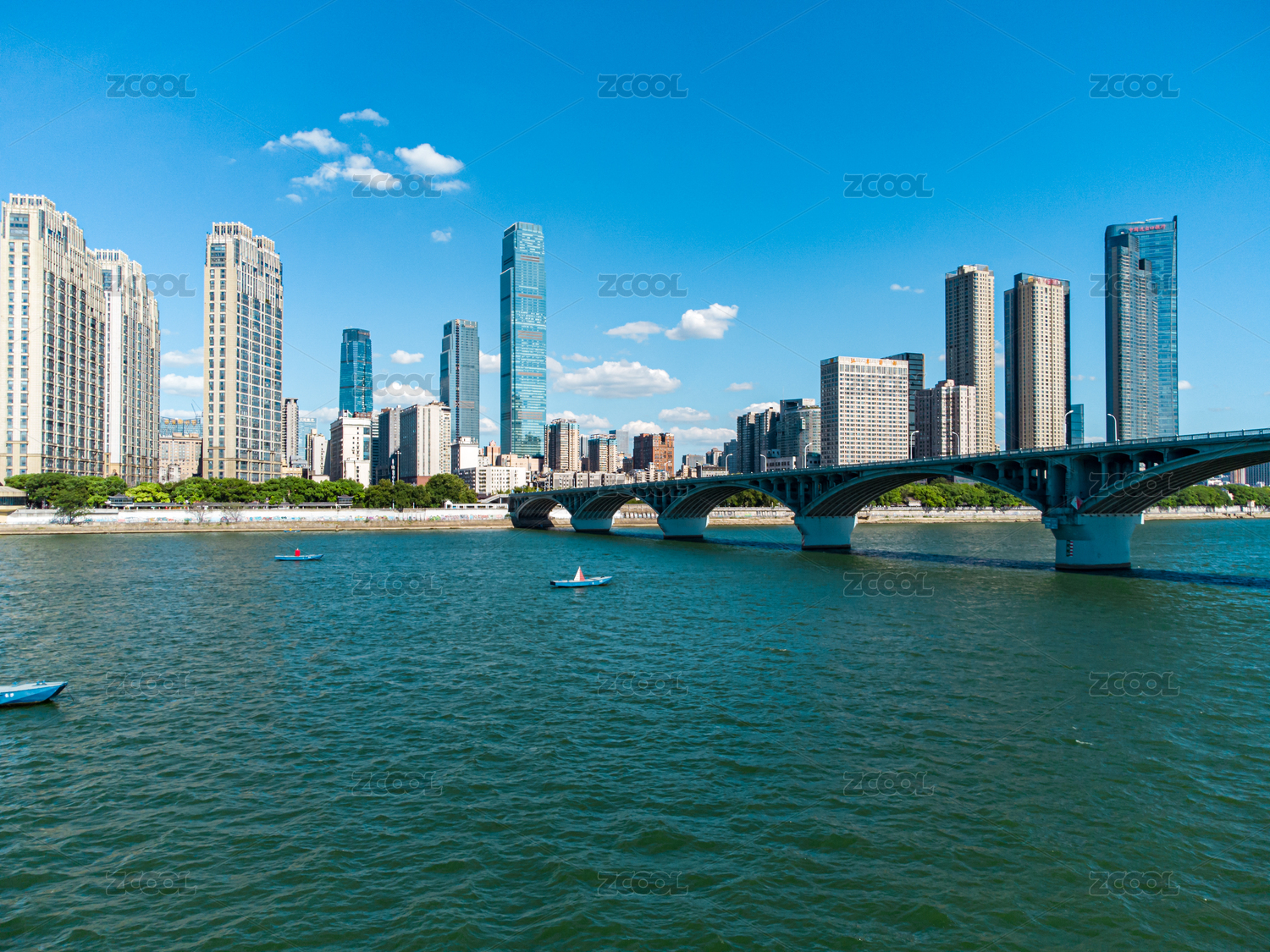中国武汉的桥梁与现代城市建筑天际线全景