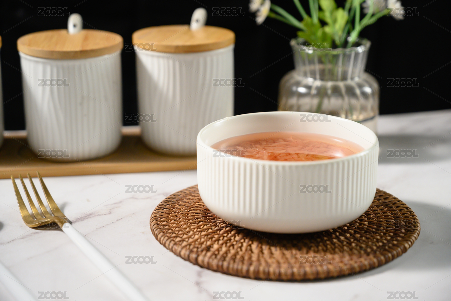 桌面上的盘子里的美味可口的冰糖炖桃胶