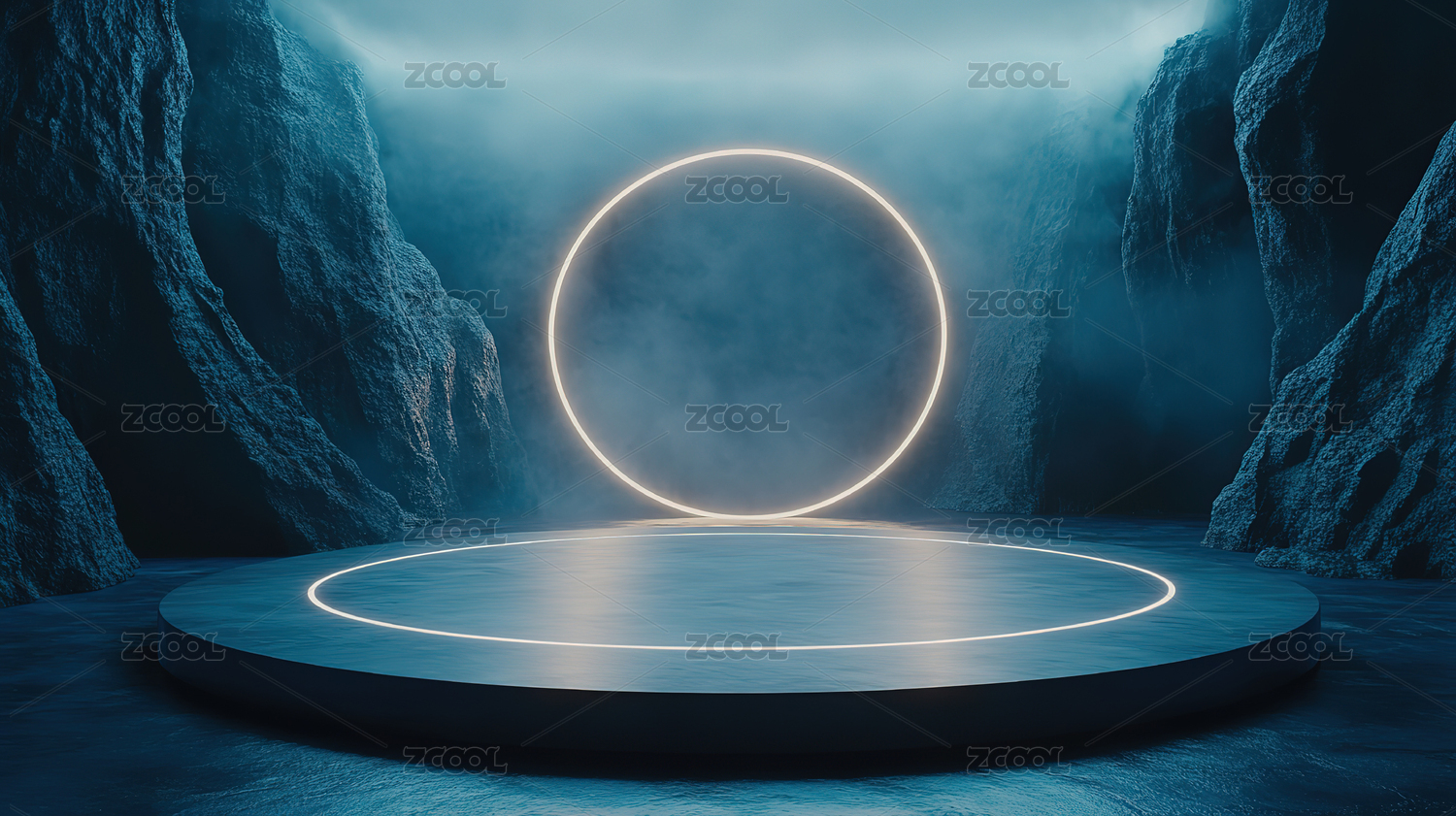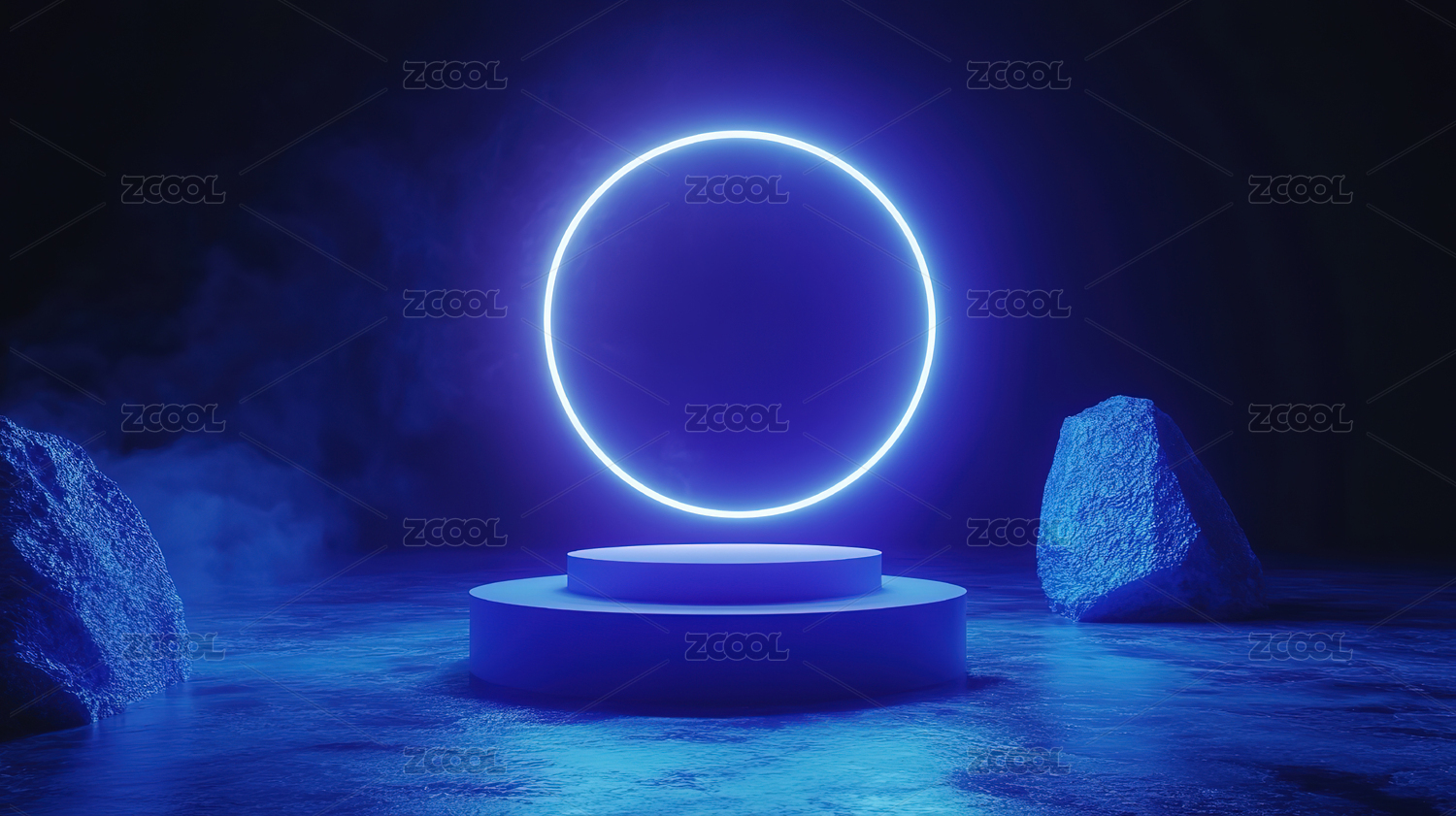 蓝色霓虹光环下的产品展示台