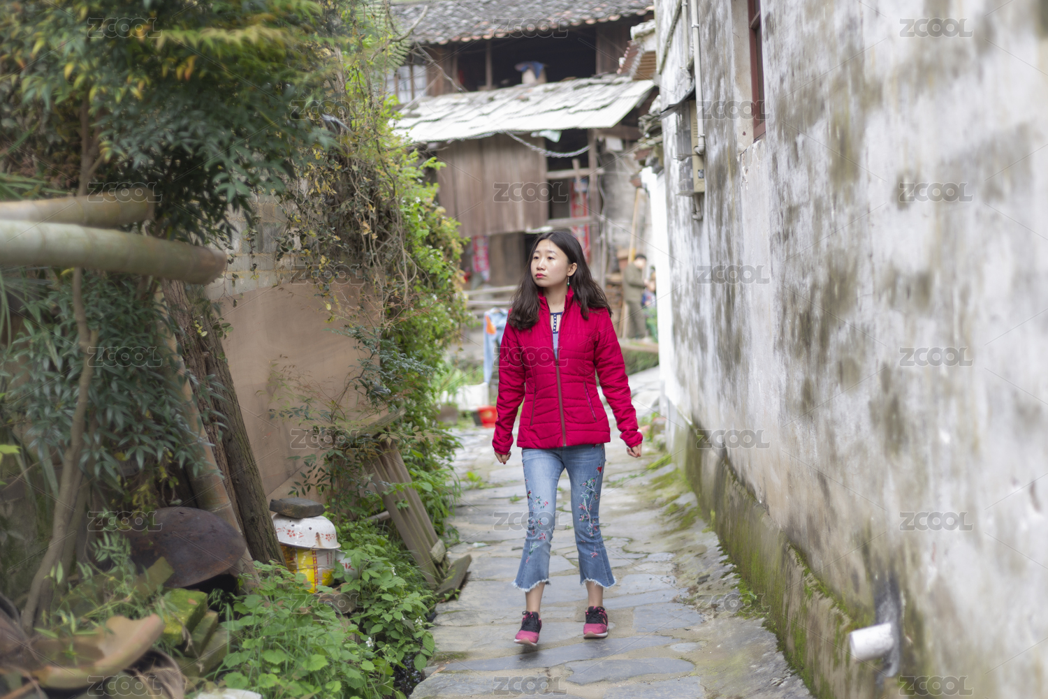 春天在江西婺源庆源村乡村小道的年轻女孩