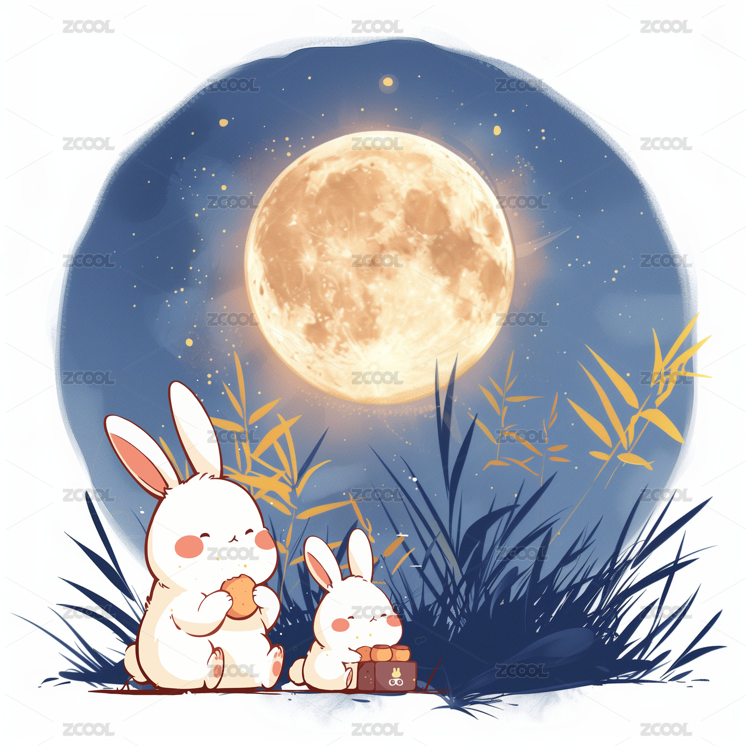 中秋节日卡通可爱兔子吃月饼团圆赏月插画