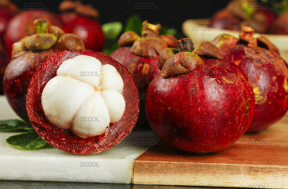 黑底上放着一盘山竹果和削开皮的进口山竹