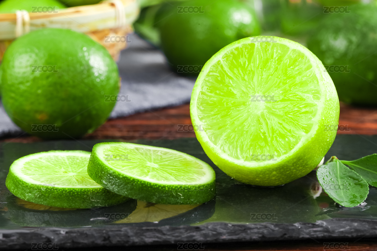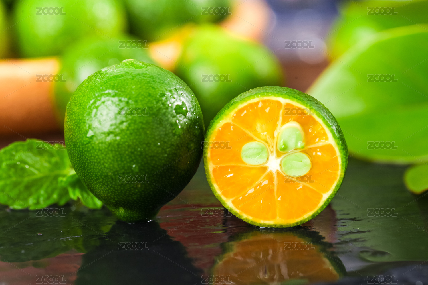 黑底上放着一堆新鲜小青桔和小青桔果肉