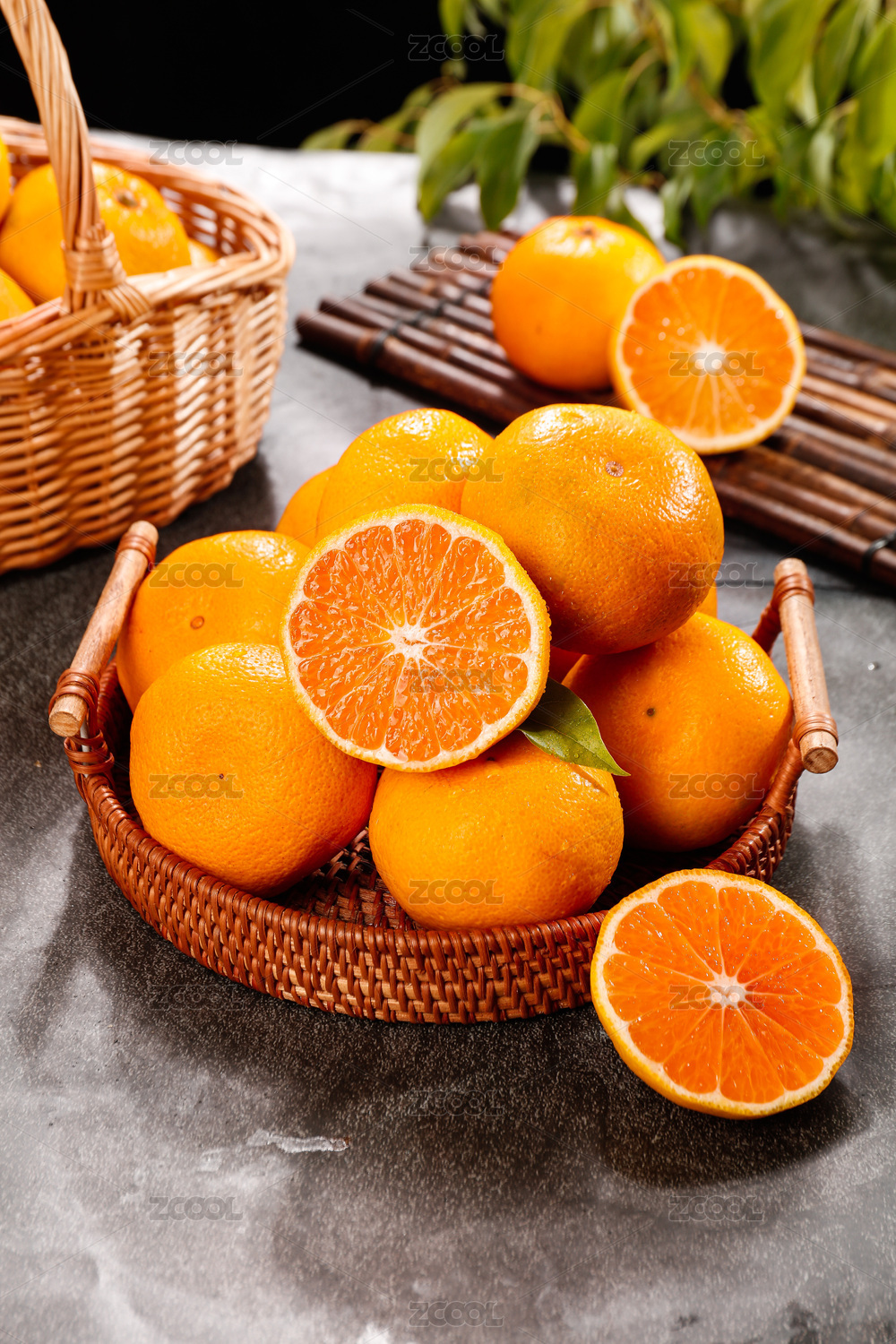 黑石板上放着一堆湖南麻阳冰糖橙和切块橙子