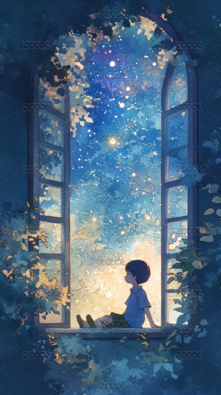 童话夜景梦幻小屋女孩望着月亮星空治愈插画