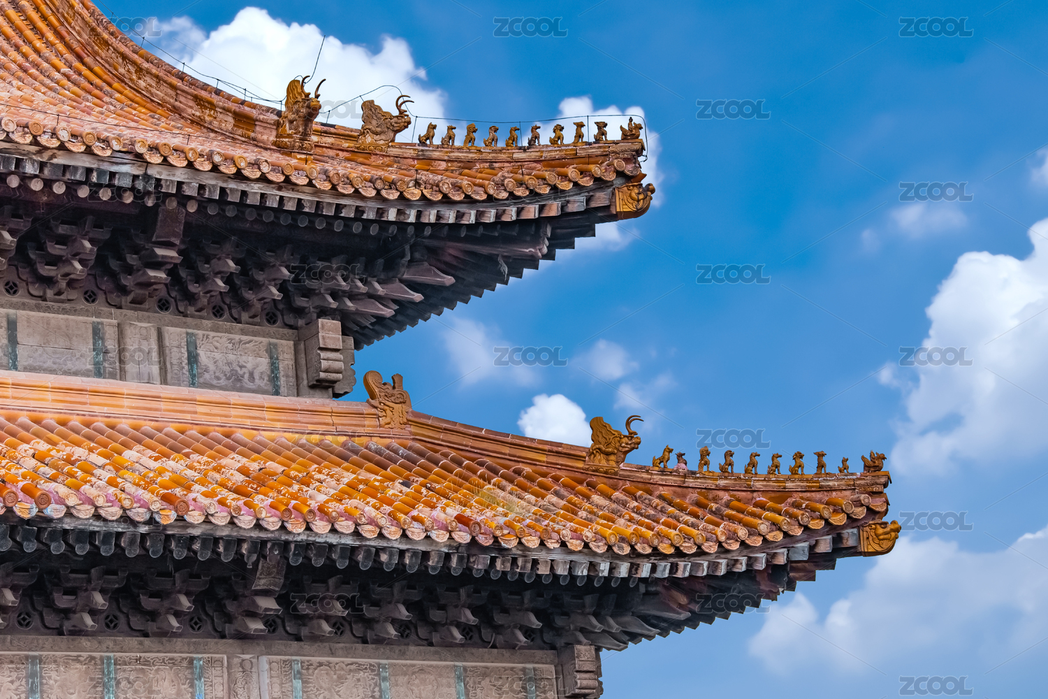 蓝天下的北京中山公园宰牲亭屋顶房檐特写