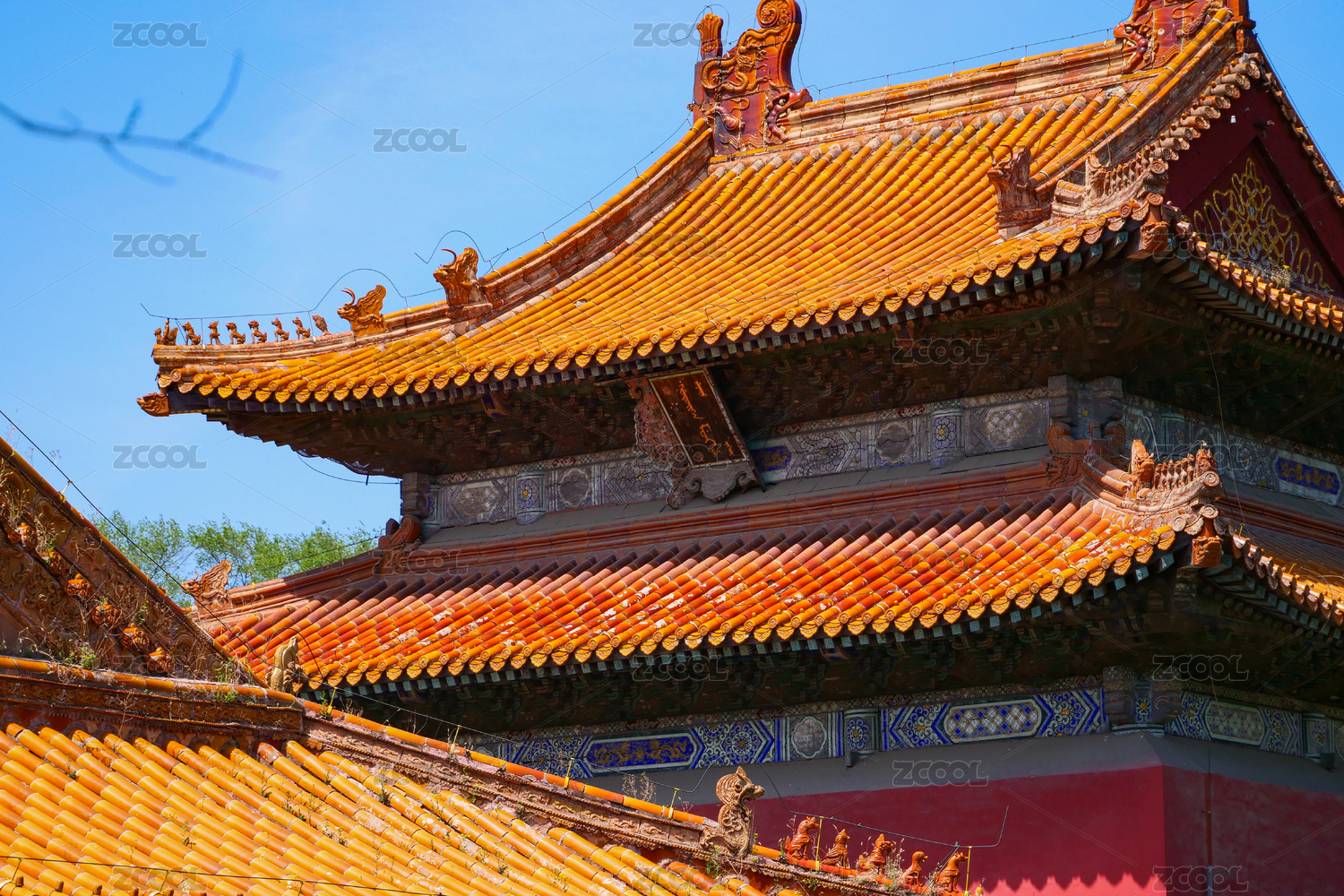 琉璃瓦歇山顶宫殿式中式建筑一角,中国山东省寿光市林海生态博览园宁国寺