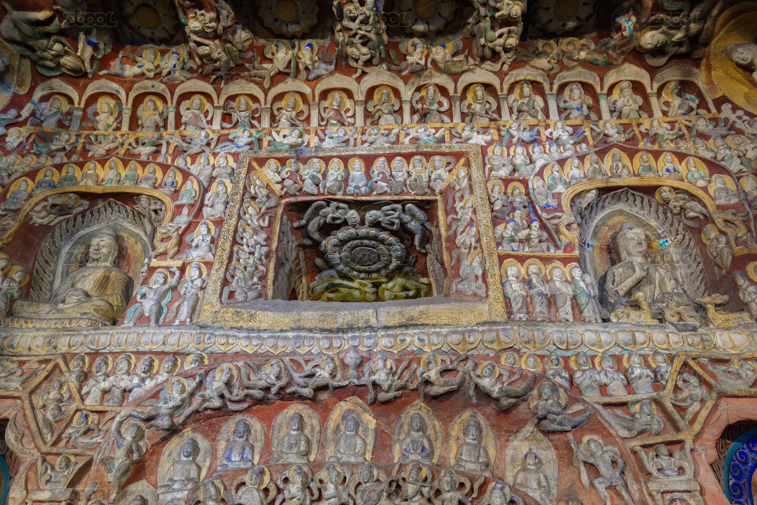 释迦摩尼雕塑像,龙塑,彩色圆形顶,悉达多太子,坐姿,圆形底座,无人,蓝天,山西,忻州
