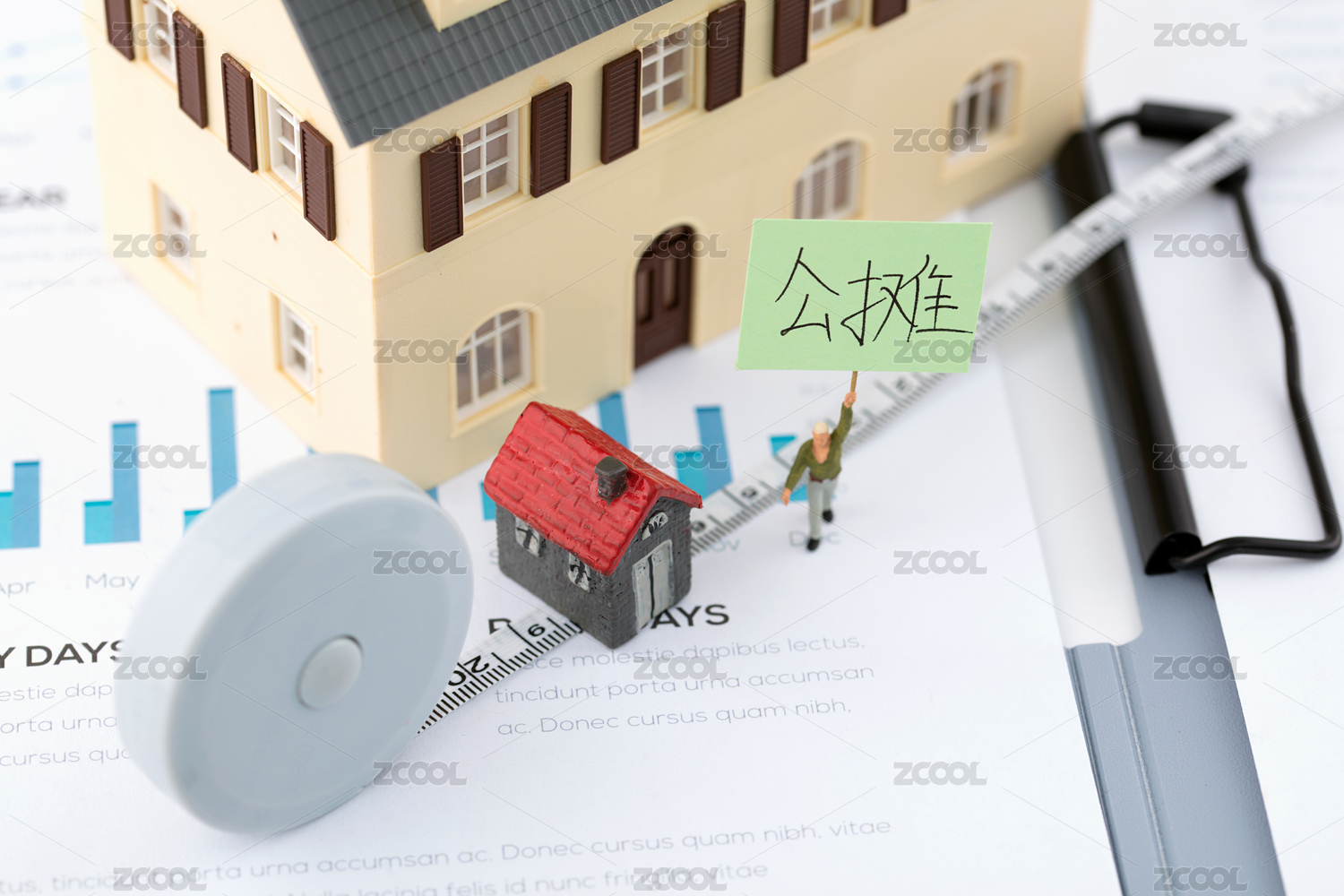 微距小人放大镜房屋房产图表报表经济金融房屋房价概念