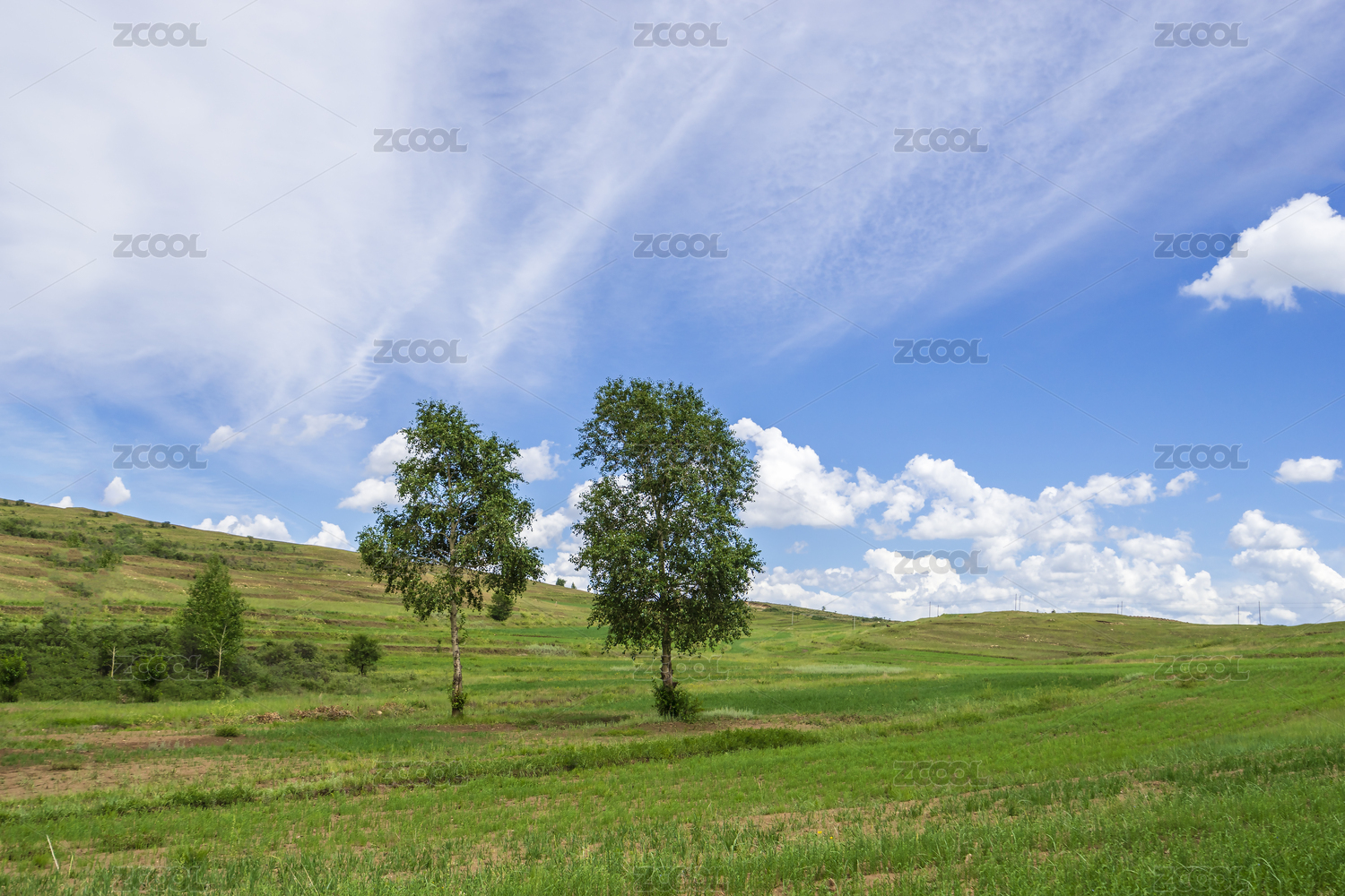 蓝天白云下绿树绿草地