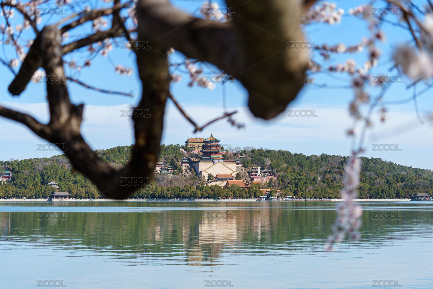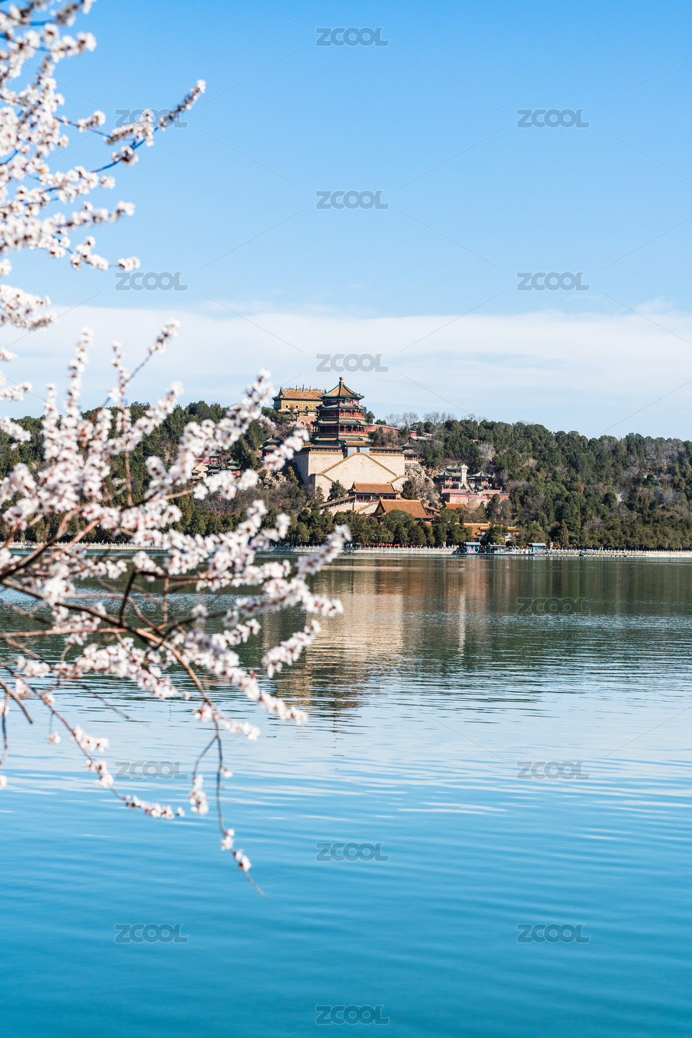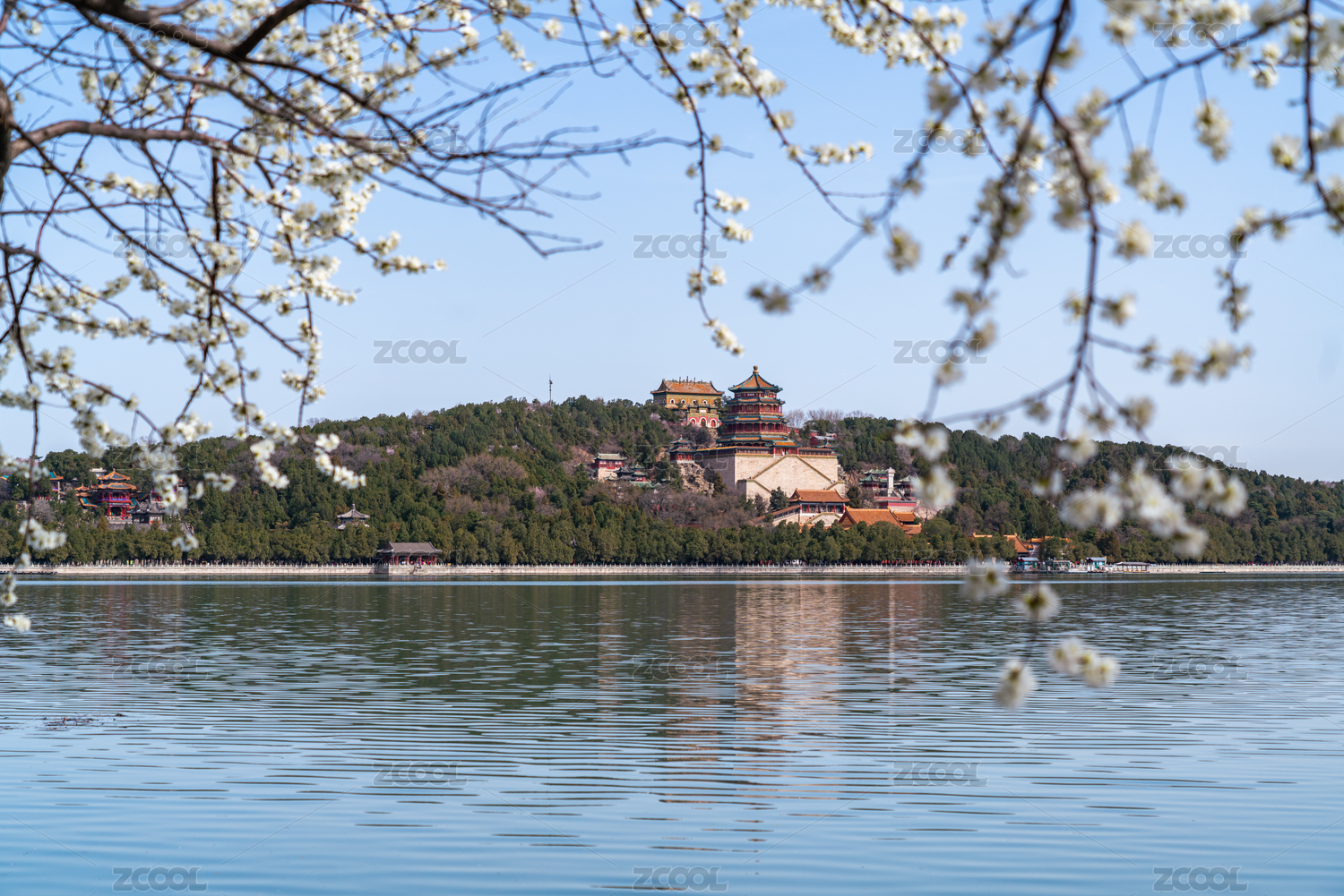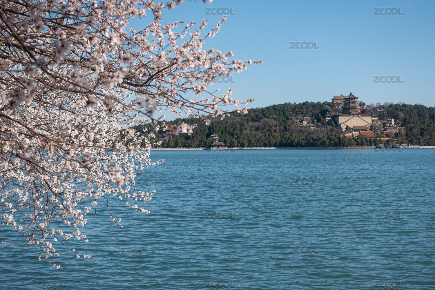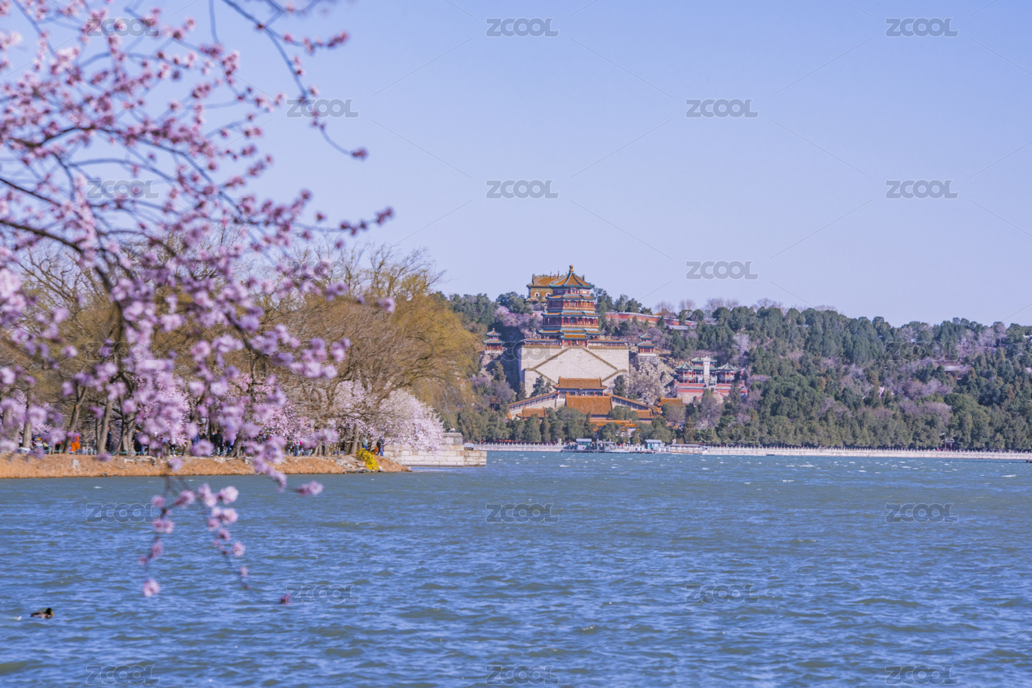 颐和园,佛香阁,昆明湖,湖,春天,春季,花,山桃花,桃花,湖面