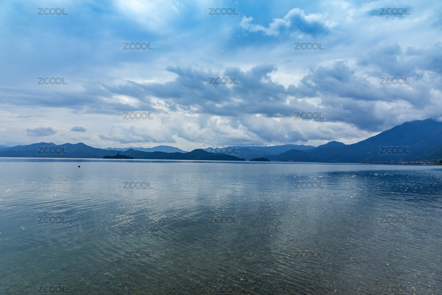 阴天环境中的湖水和远山风光