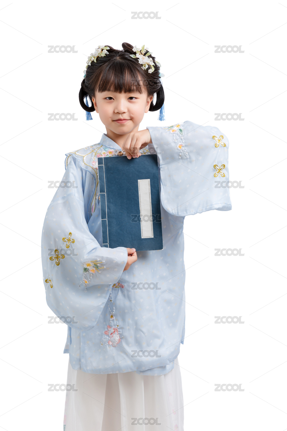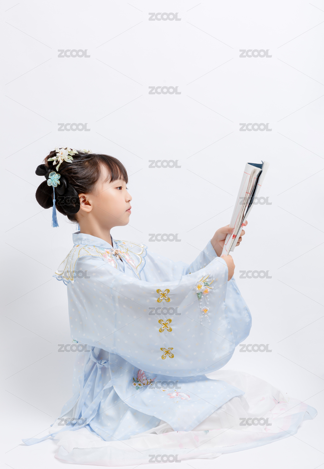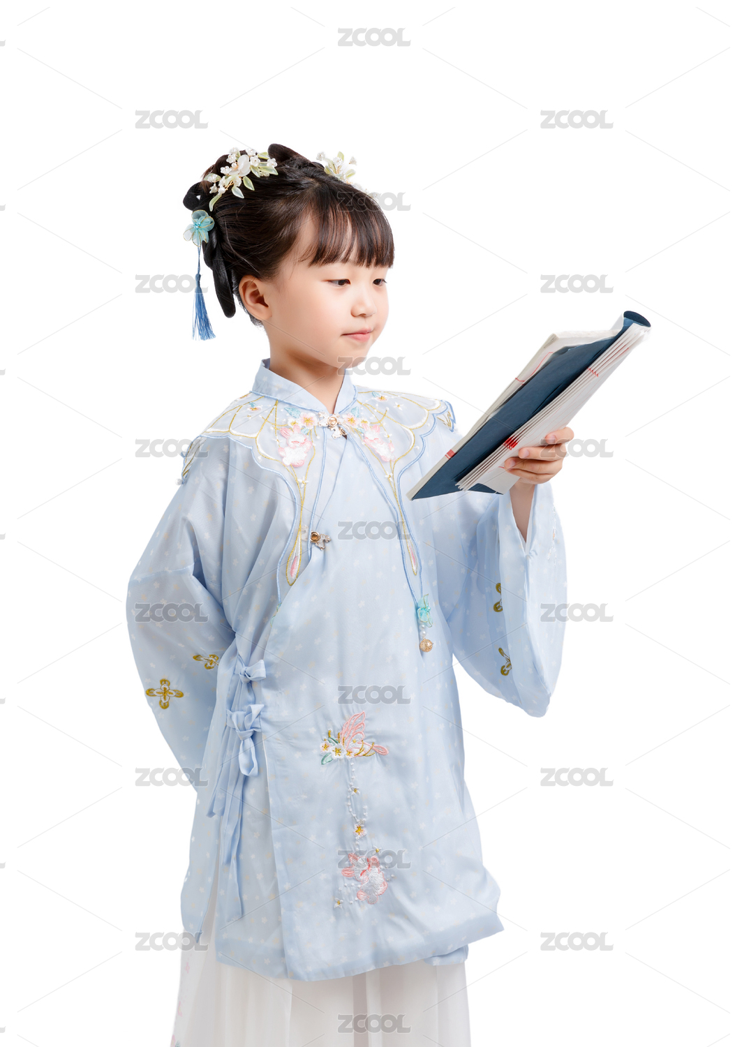 身穿中国古典唐装手拿古书的小女孩棚拍肖像