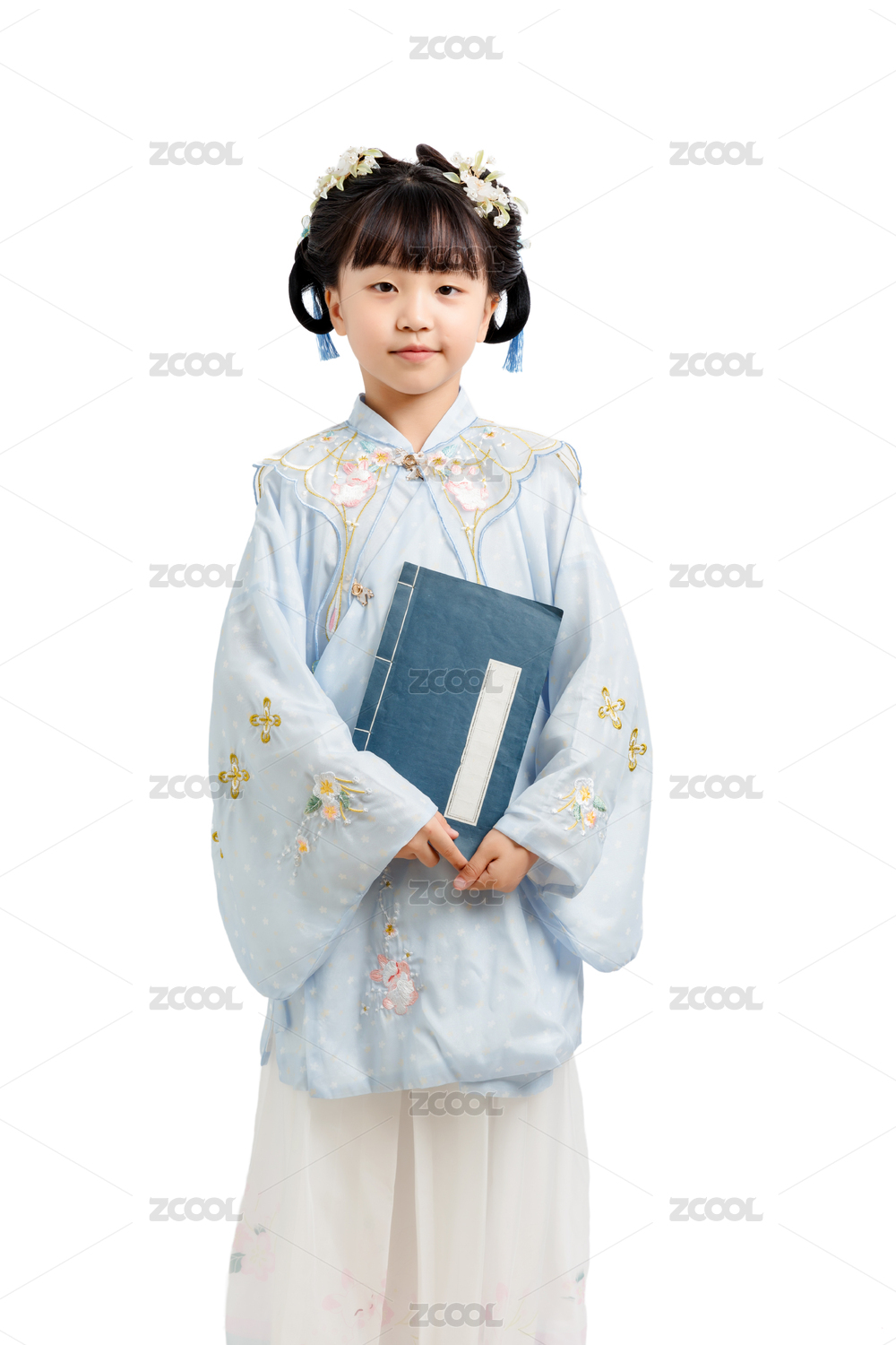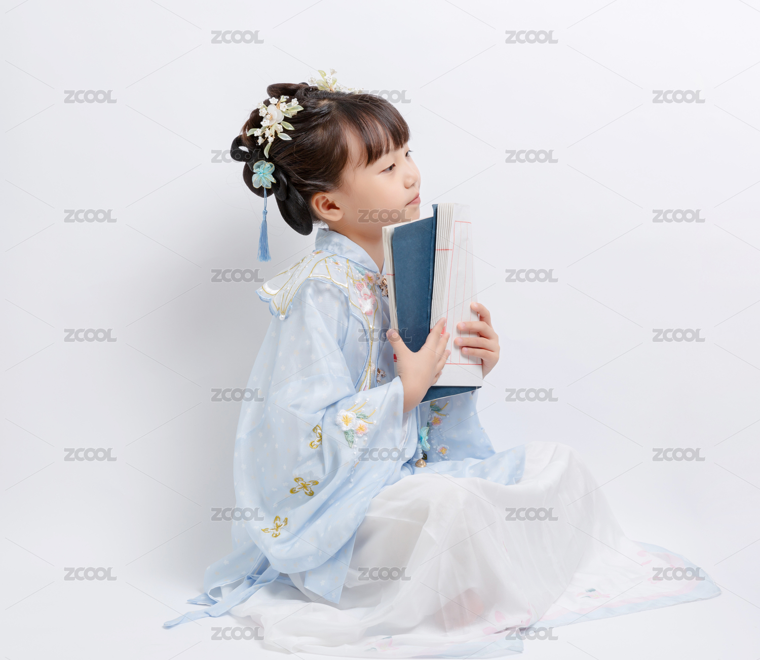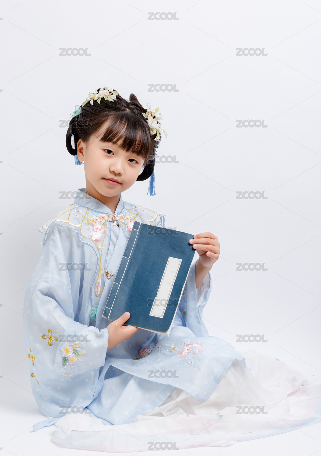 身穿中国古典唐装手拿古书的小女孩棚拍肖像