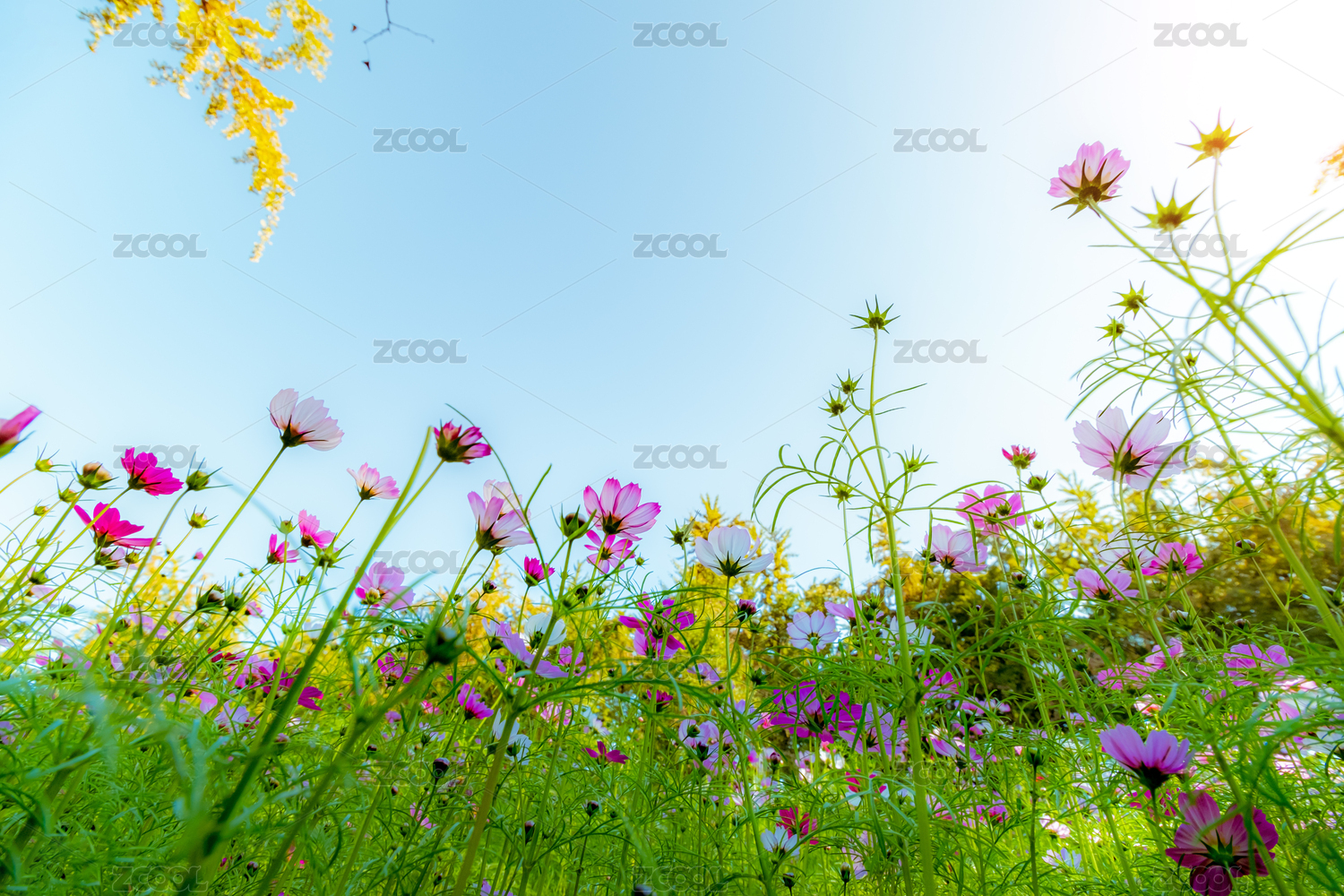 在草丛中仰拍蓝天下的波斯菊花株