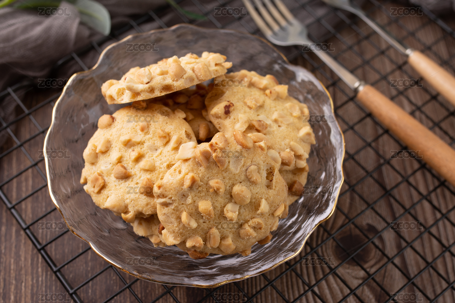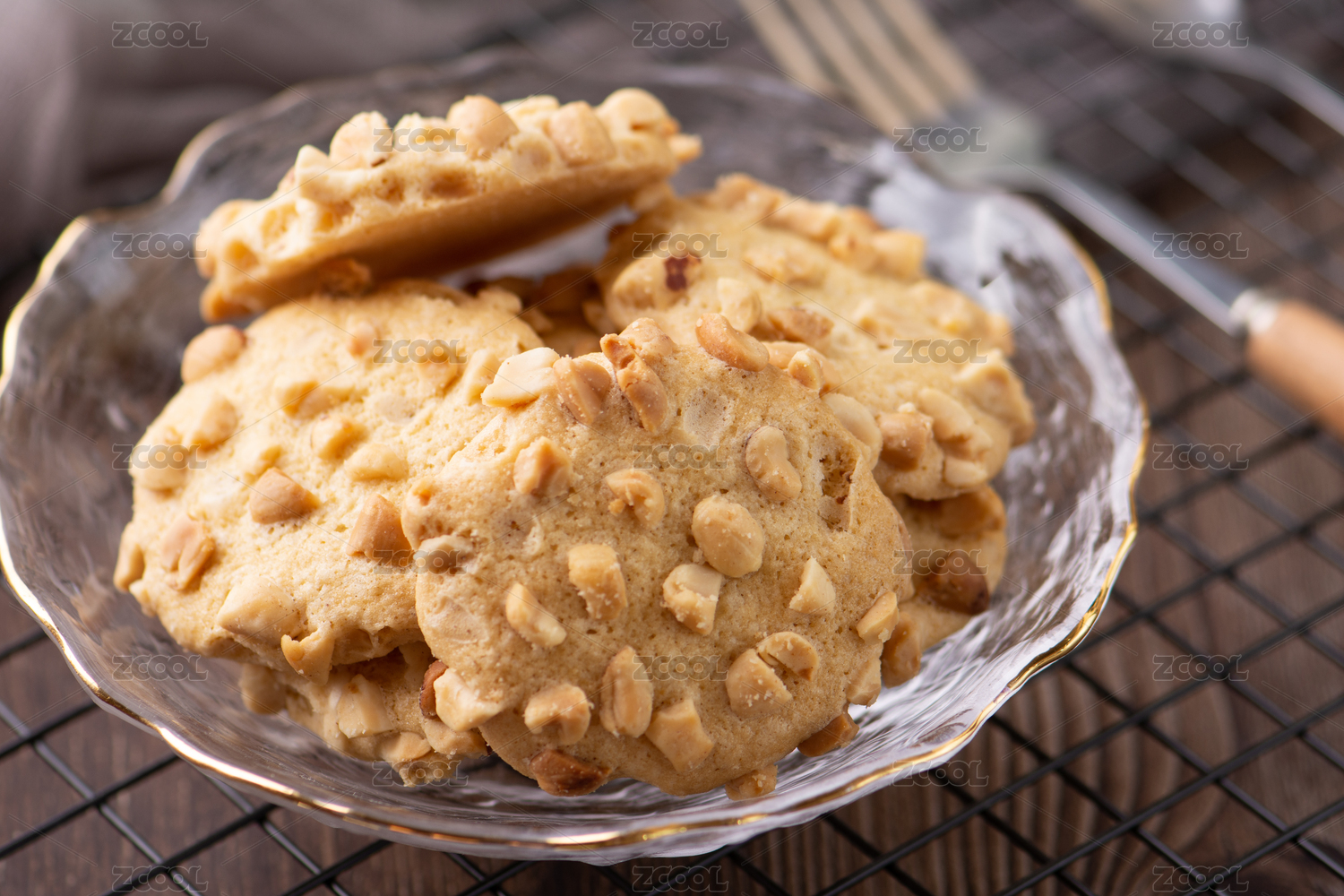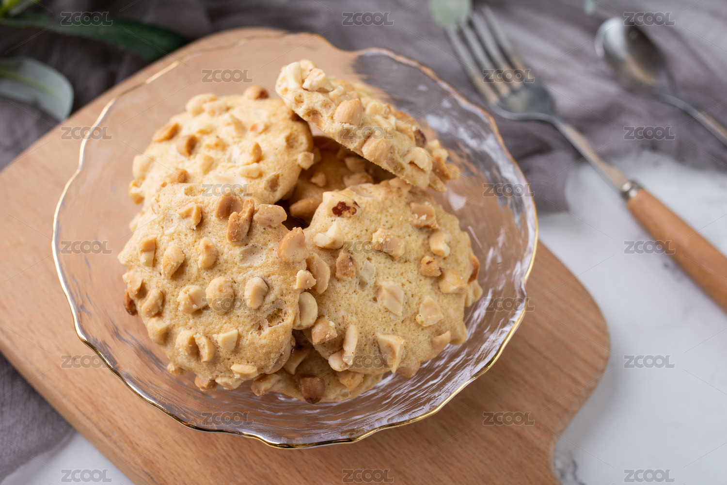 桌面上的玻璃碗里的美味可口的花生曲奇