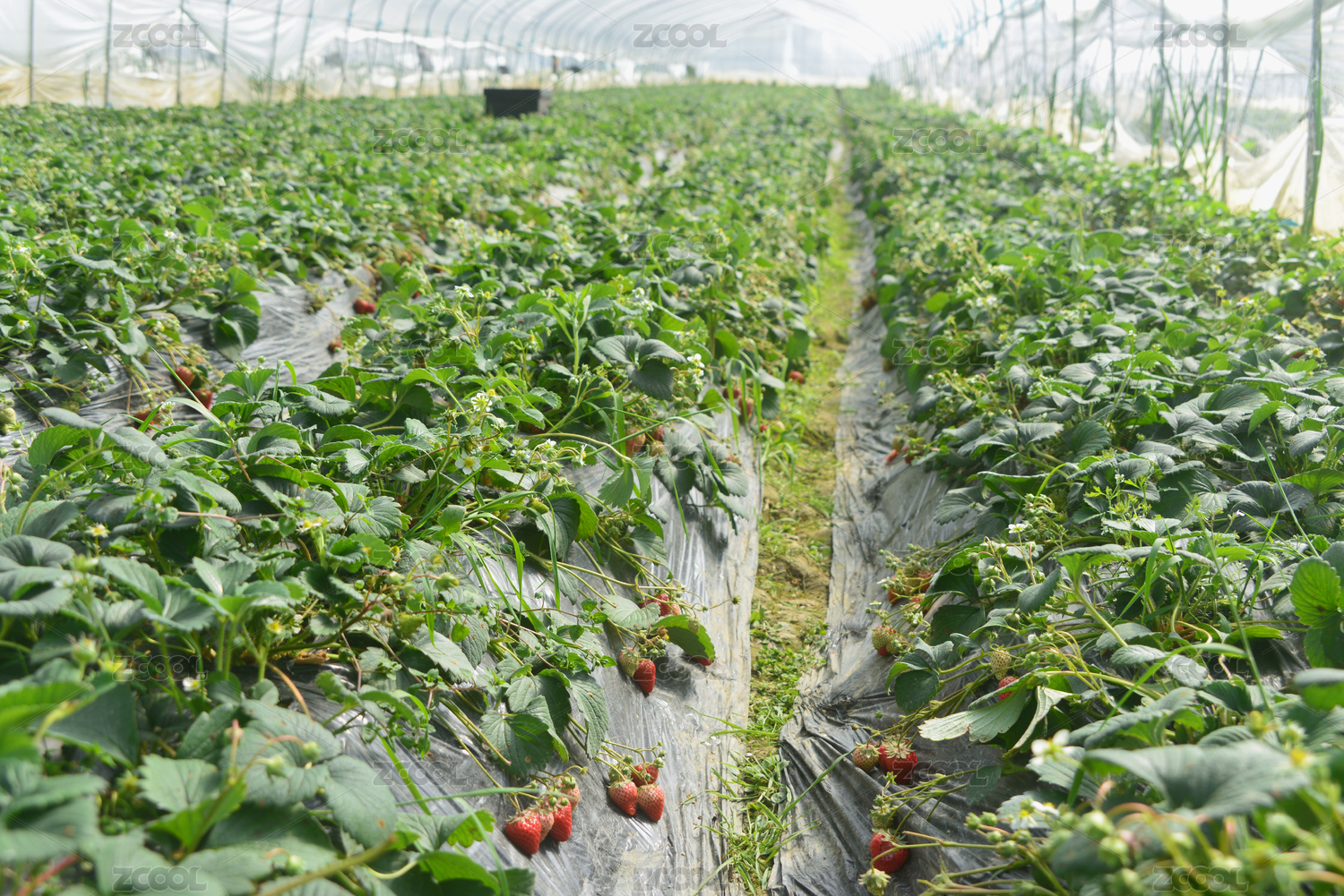 正在采摘期的大棚种植的草莓