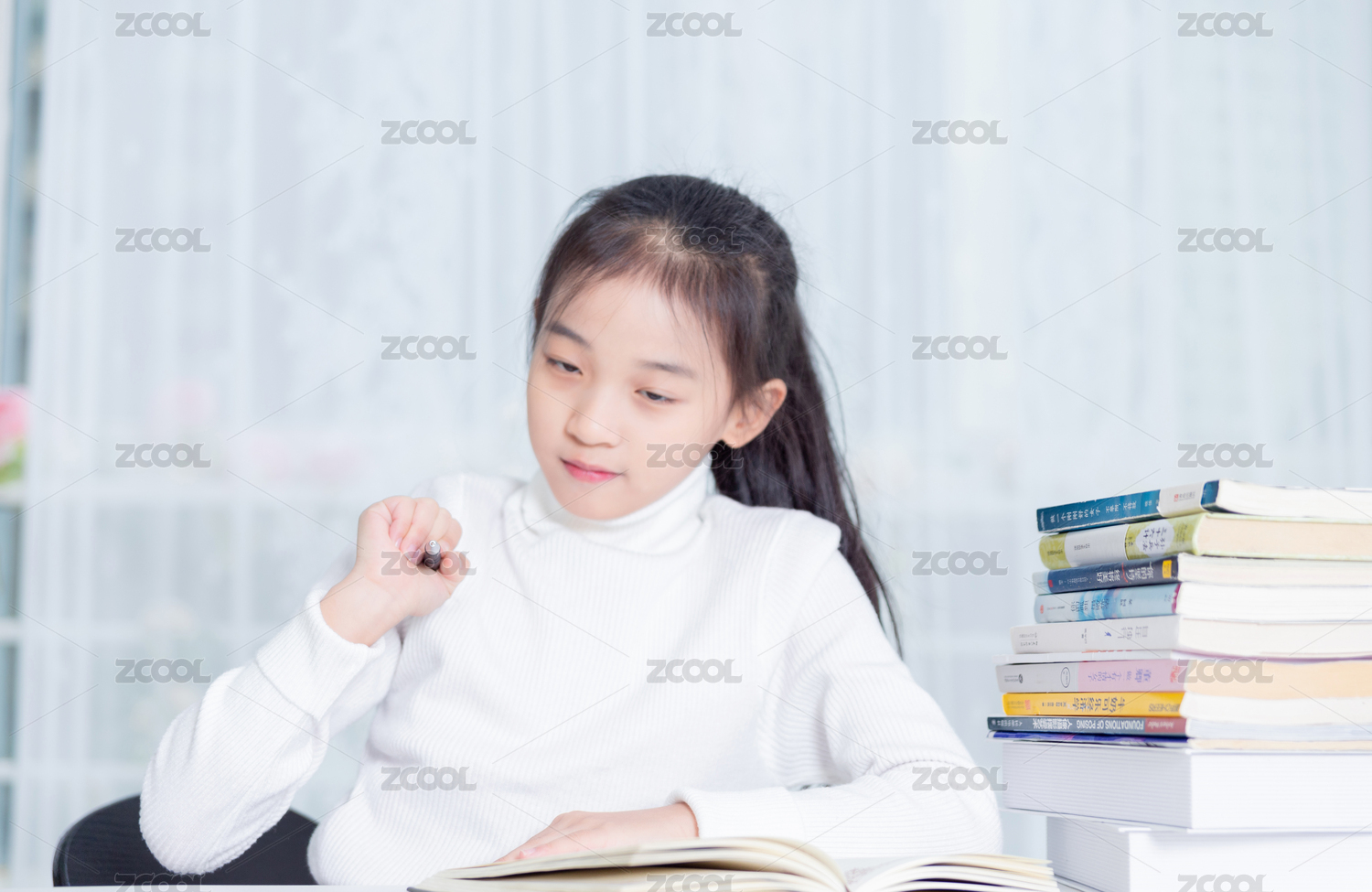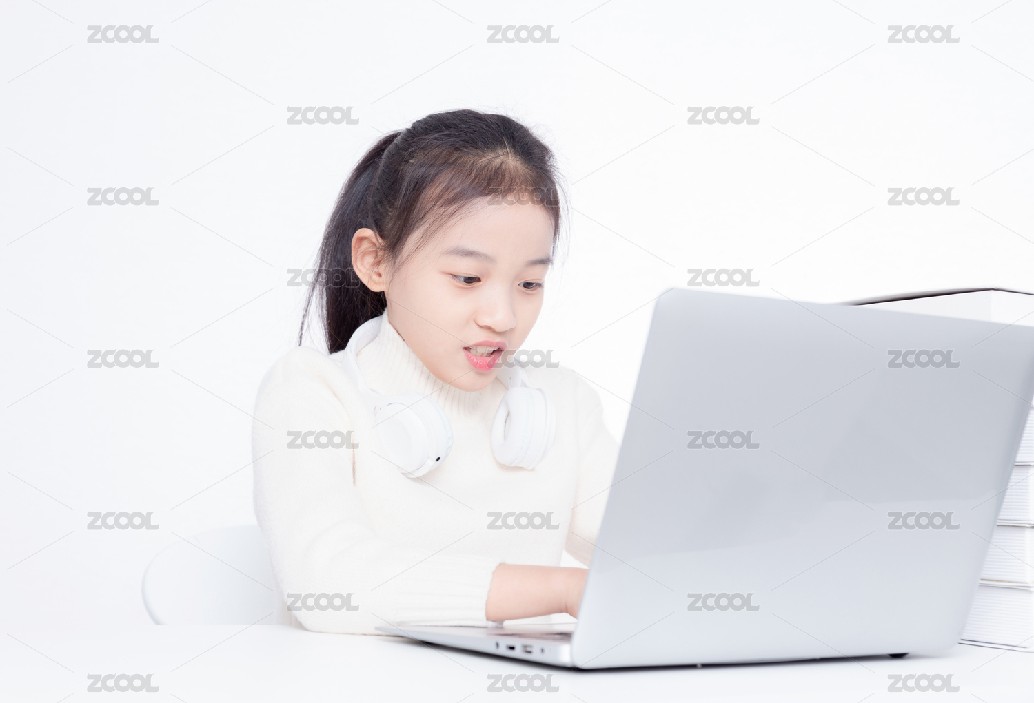 东方人,中国,黄种人,女孩,小学生,白色背景,作业,书,课本,耳机