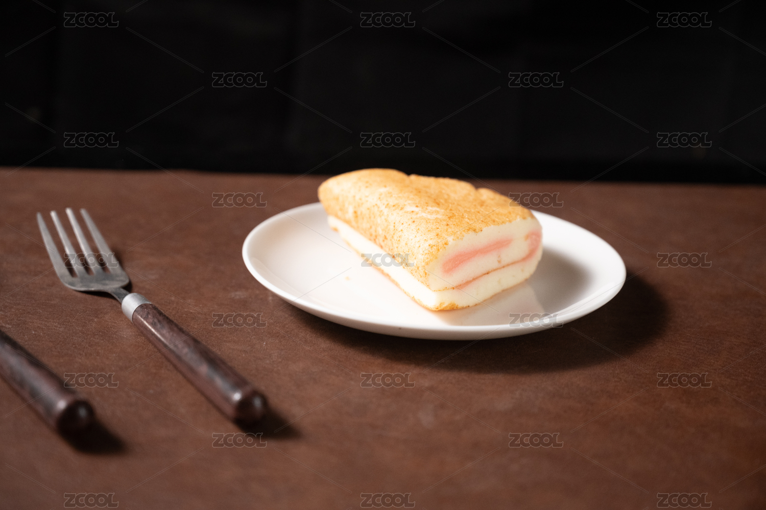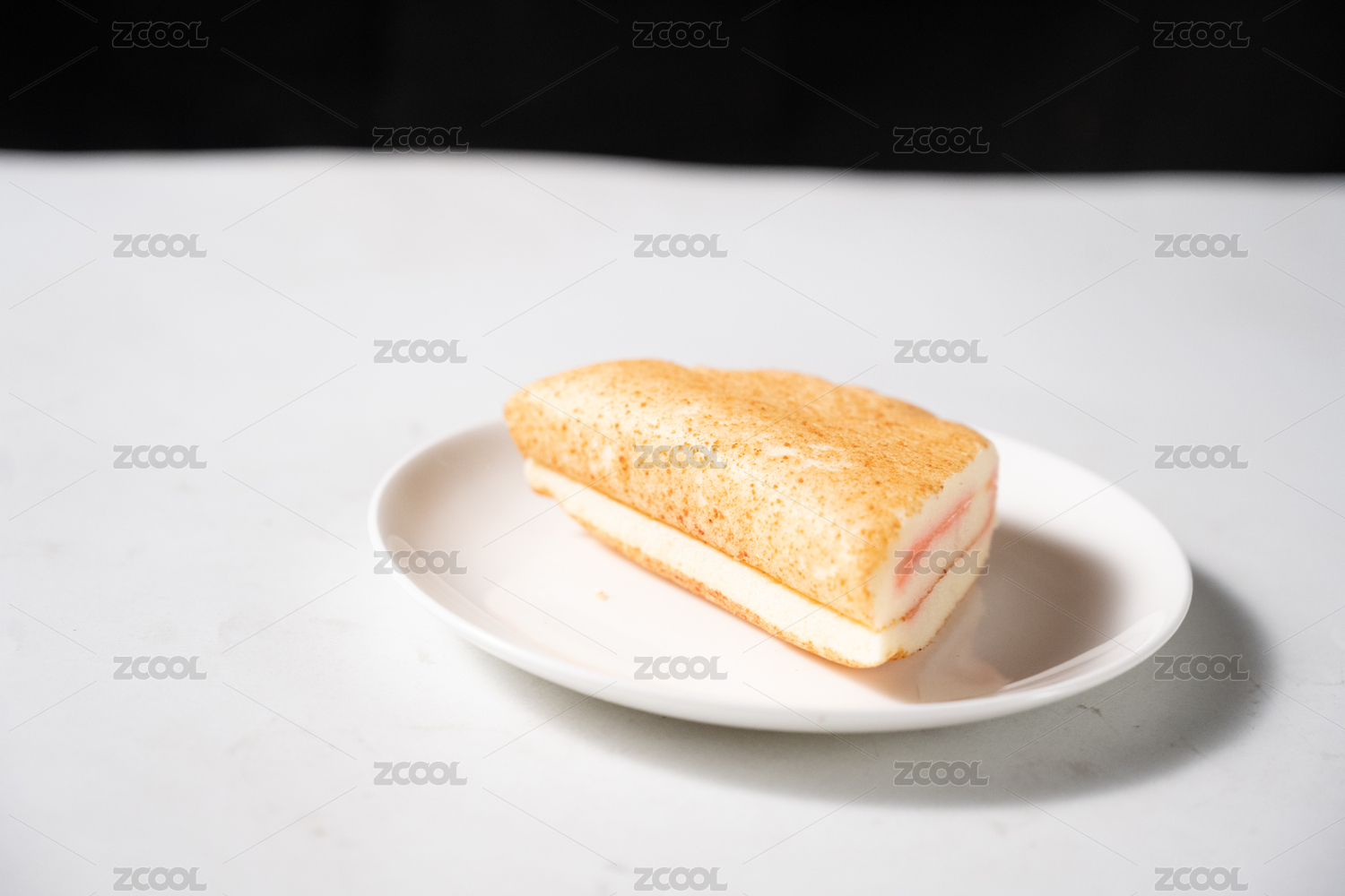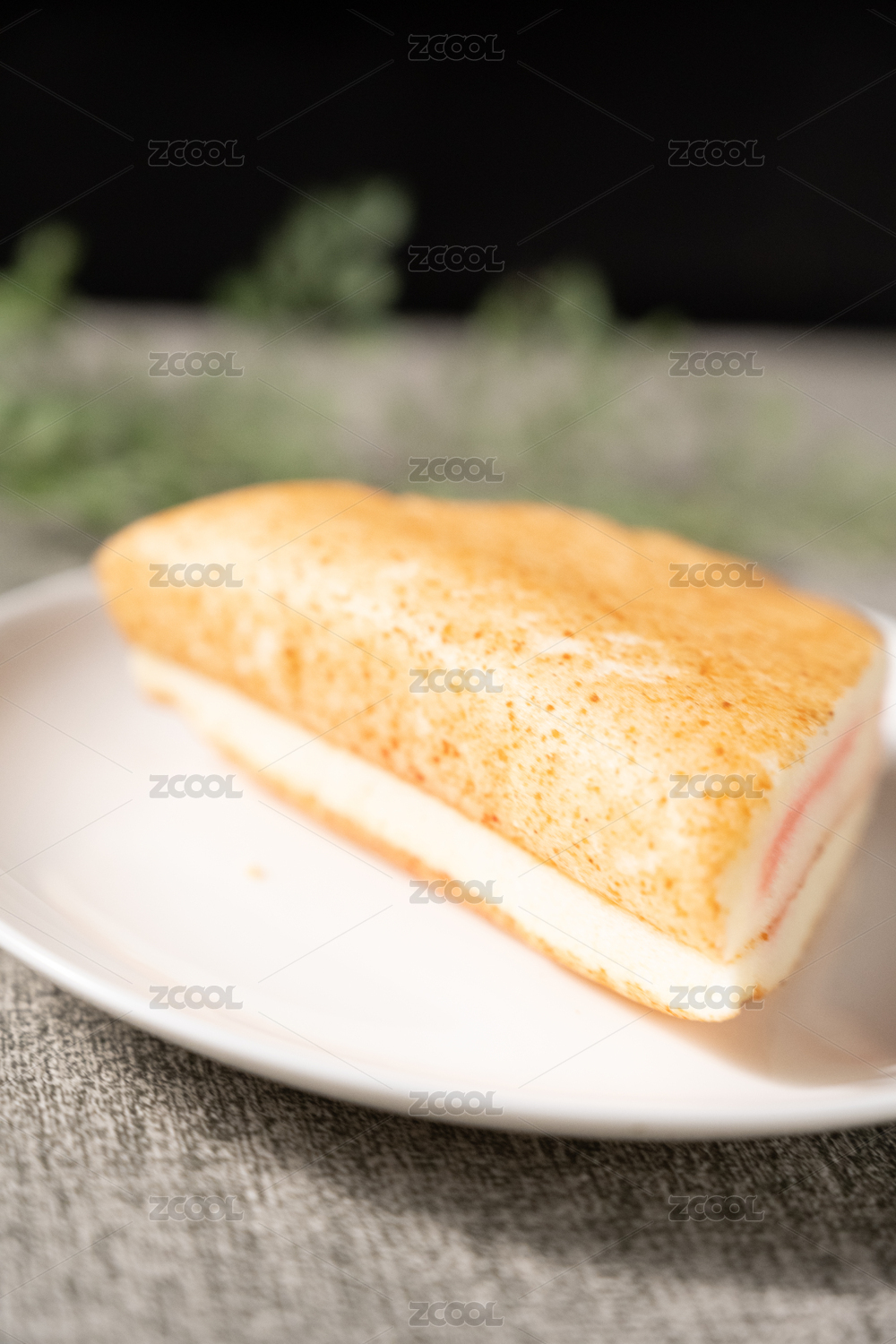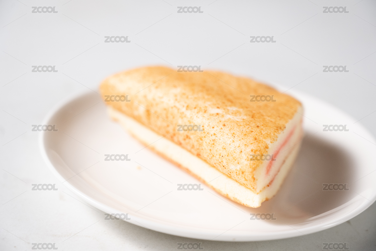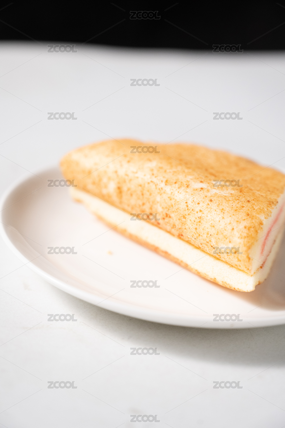 桌面上的盘子里的美味可口的草莓蛋糕卷
