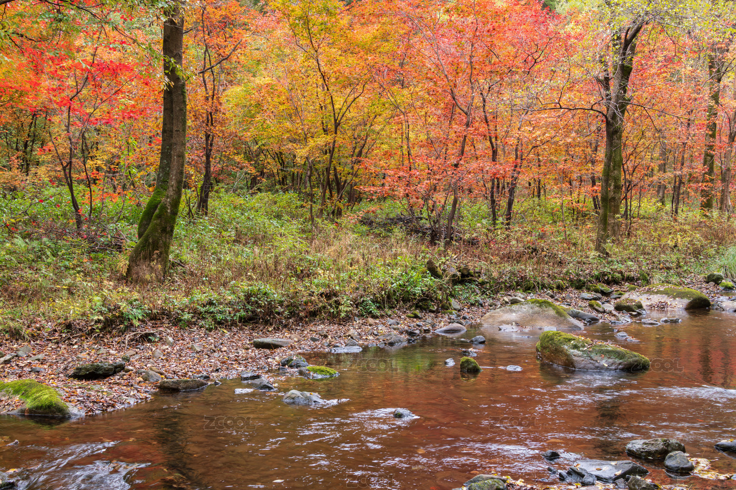 长白山望天鹅景区小溪边的红叶林