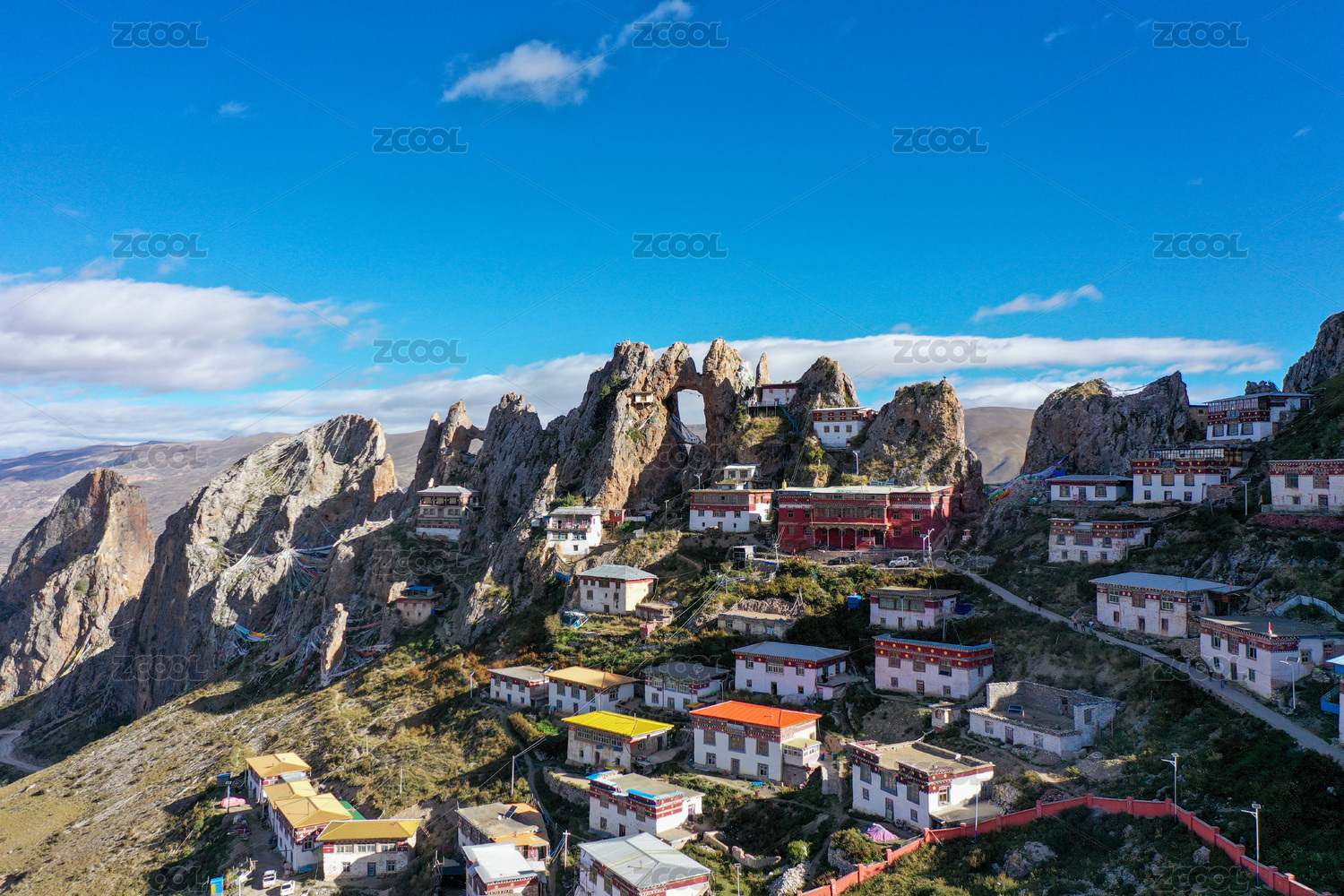 中国西藏丁青县孜珠山上高原寺庙孜珠寺航拍