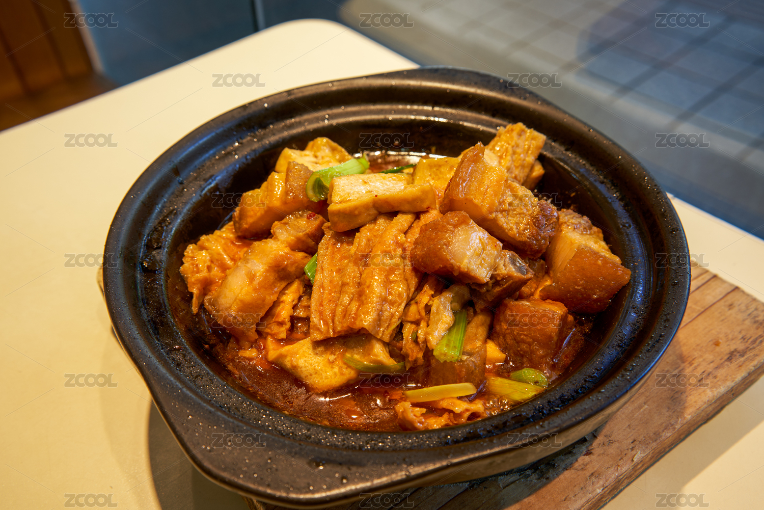 黑色砂锅装的砂锅鲍鱼鸡块摆放在樟木砧板上