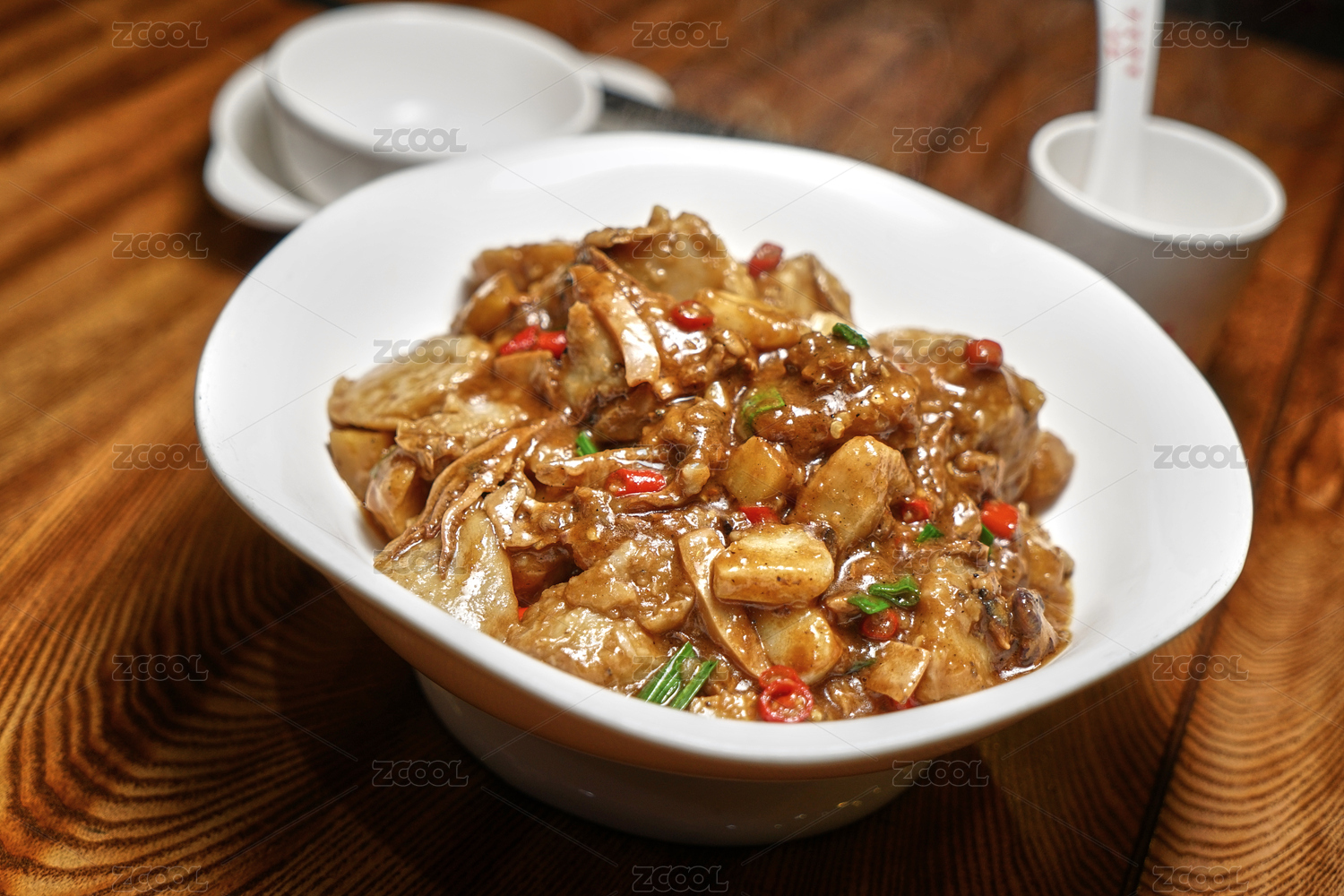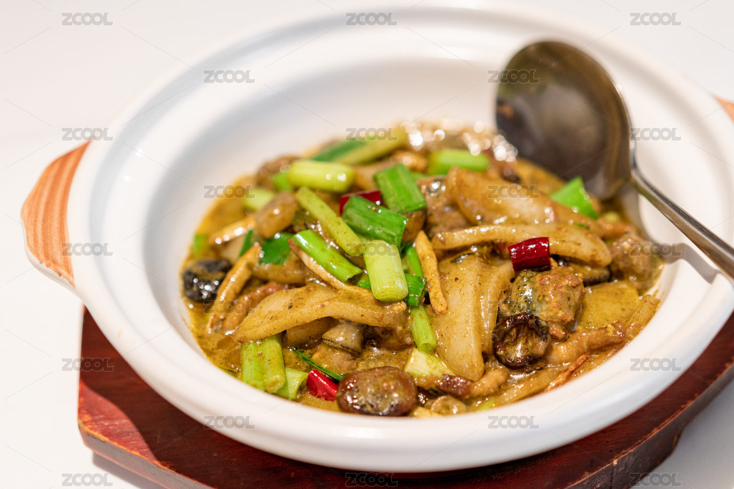 创新菜品鱿鱼烧芋头盛放在白色瓷碗里