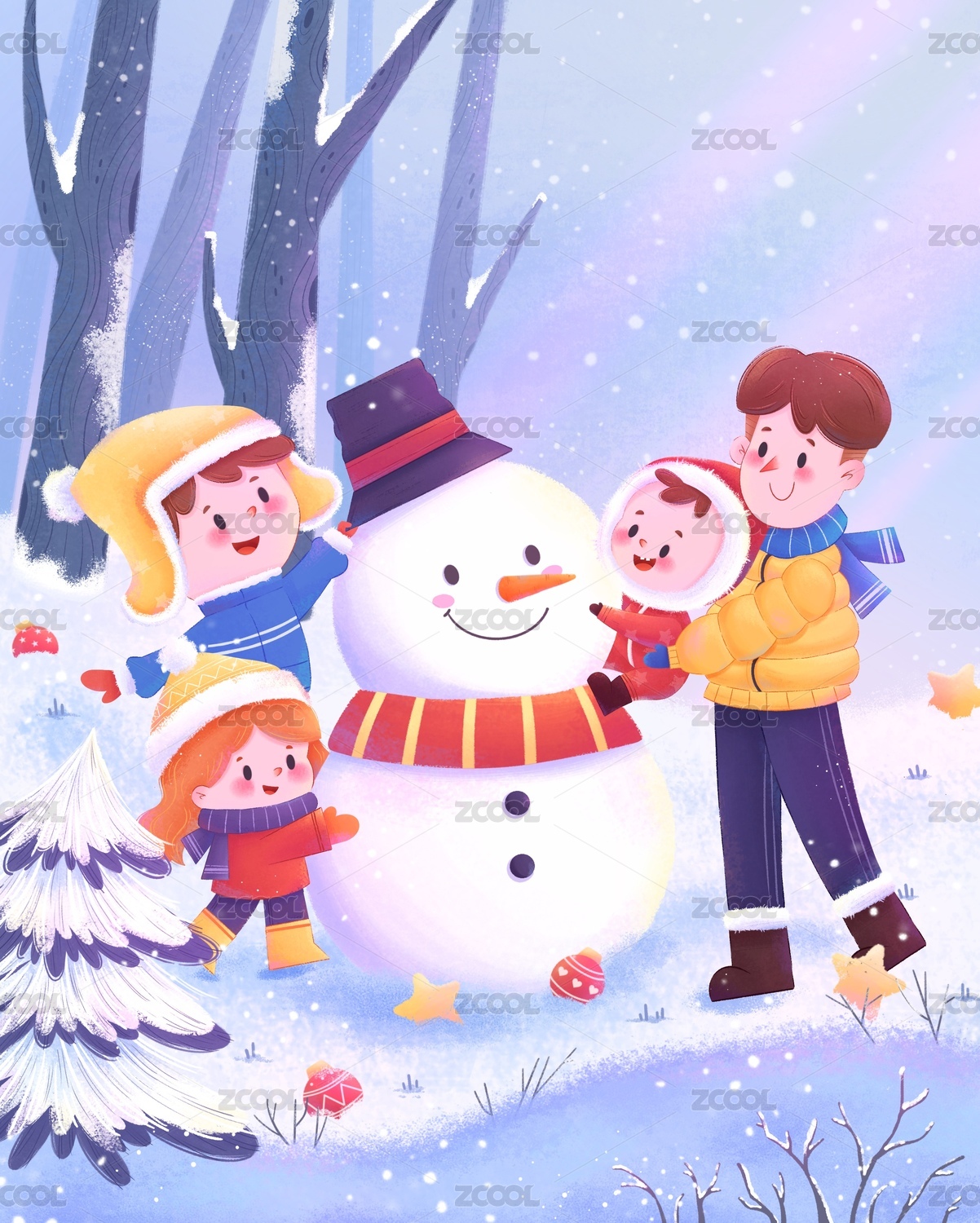 冬天爸爸带着三个孩子在雪地里堆雪人