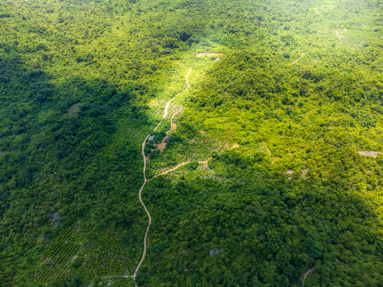 云南山区原始森林里的小路航拍图片