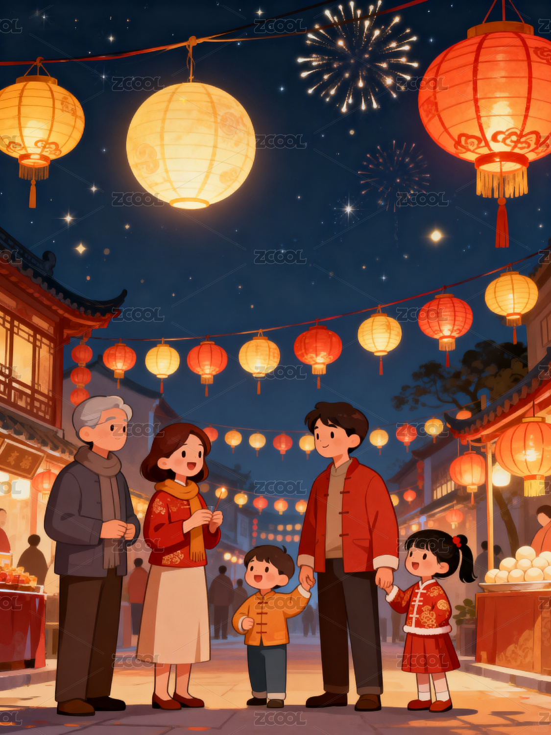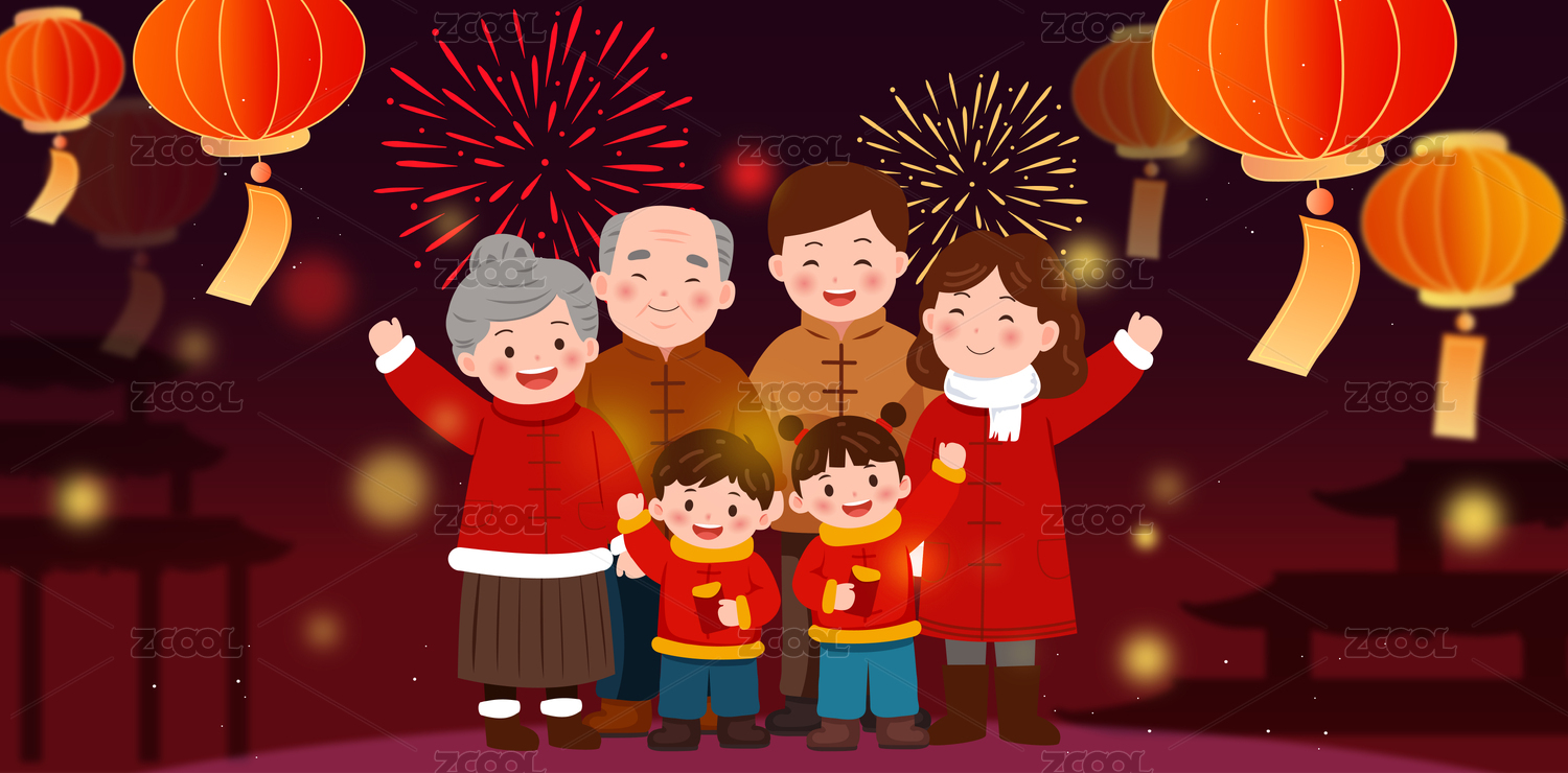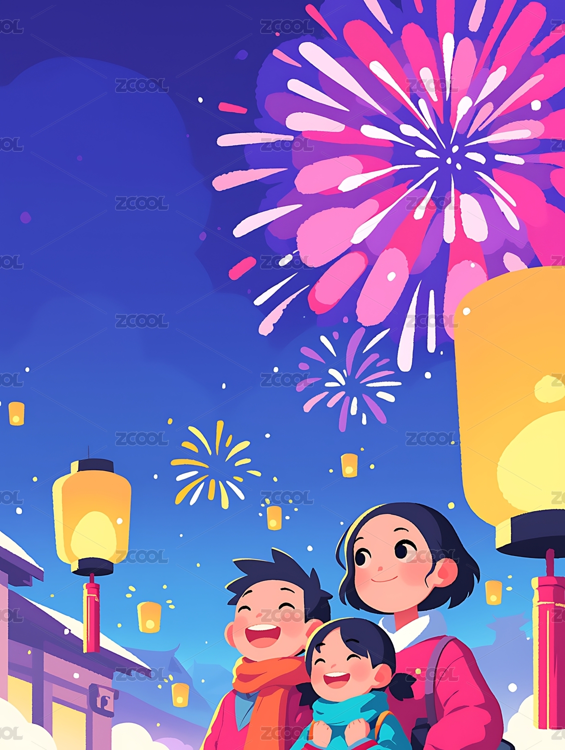 新年春节三口之家鞭炮烟花灯笼矢量插画