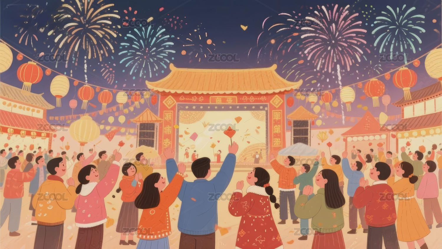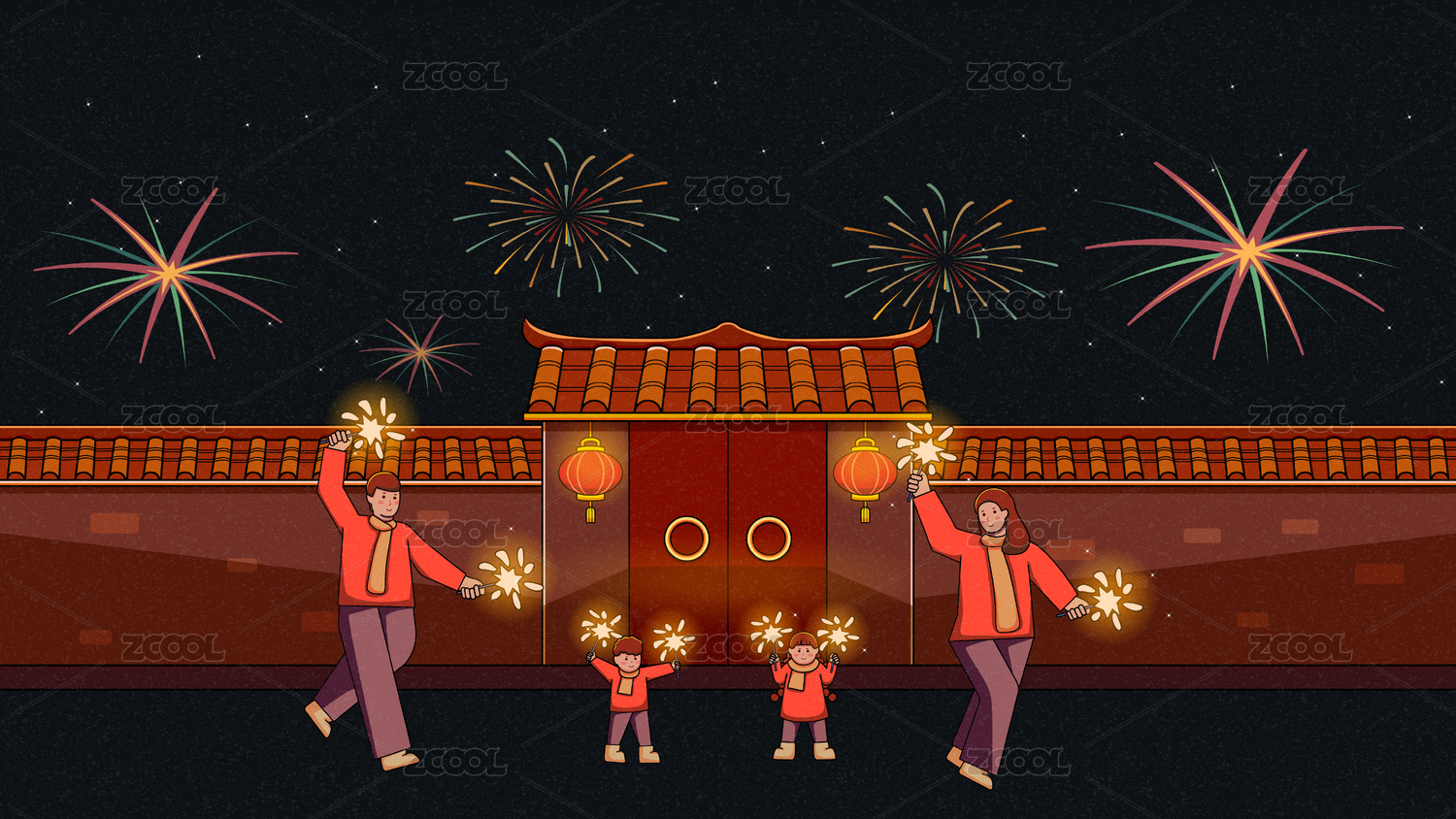 中国文化,传统,庆祝,背景,国潮风,渐变,插画,节日,过年,烟花
