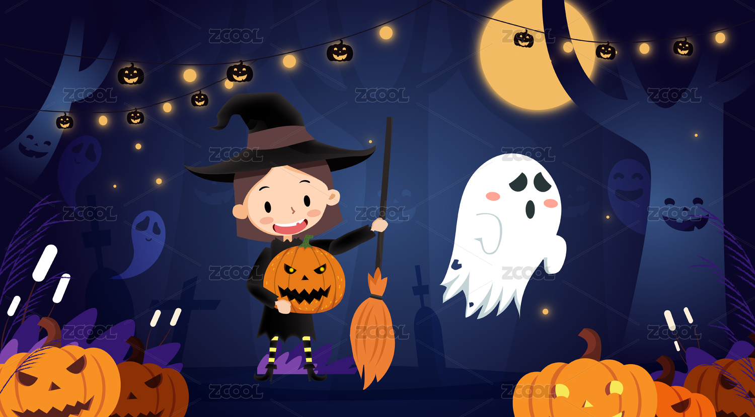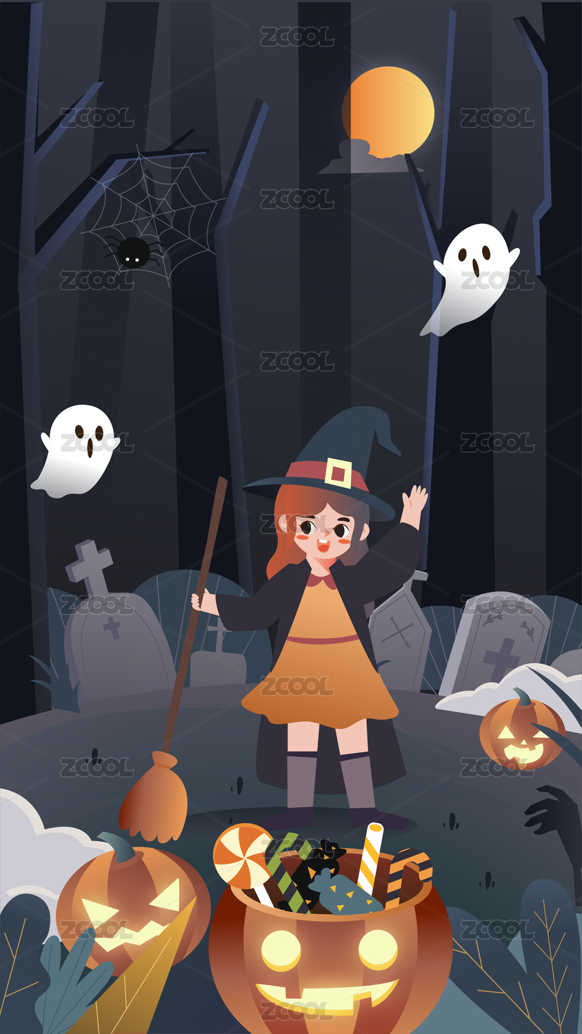 卡通手绘万圣节鬼怪巫婆闪屏插画