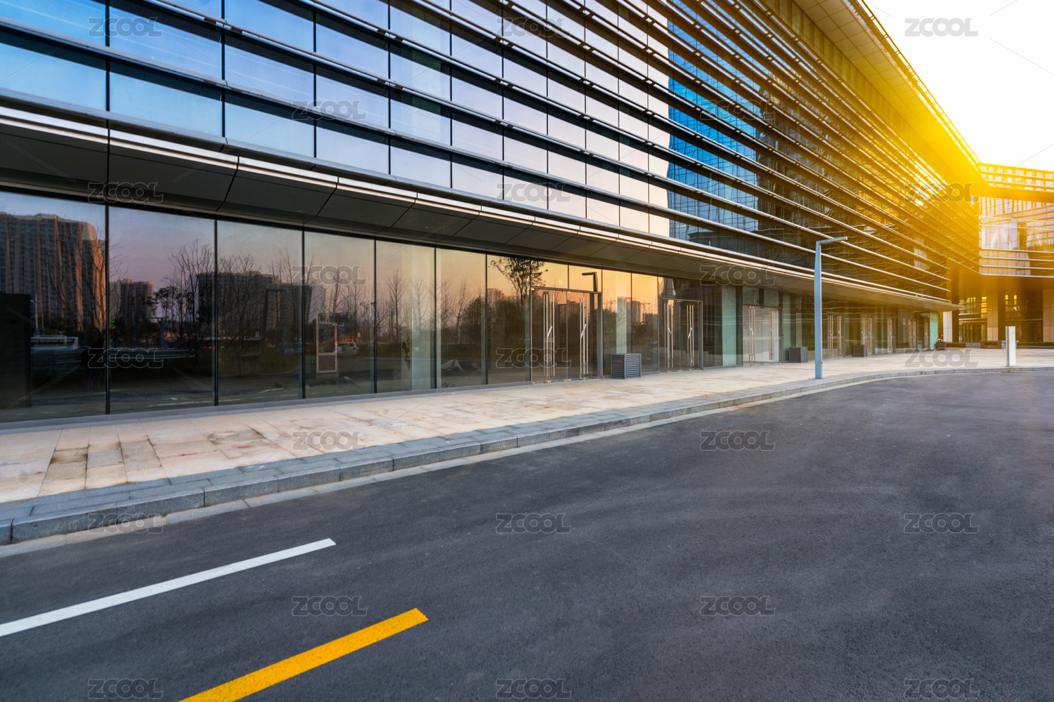 沿着中国城市现代化的商务楼宇空柏油路。