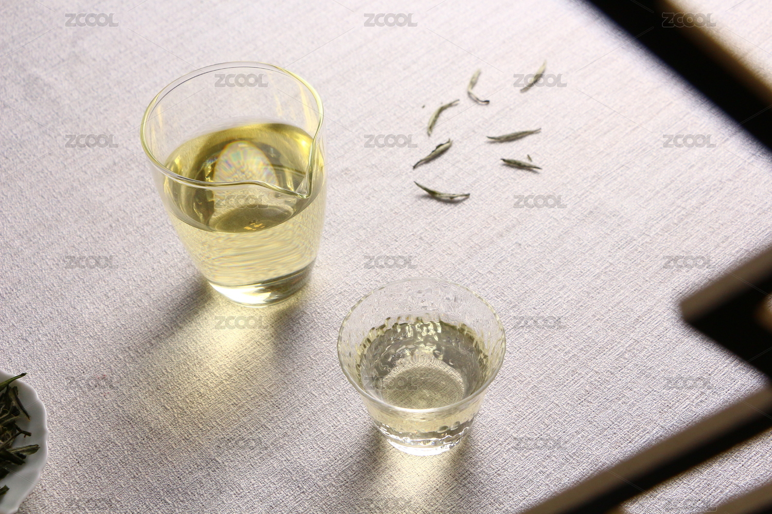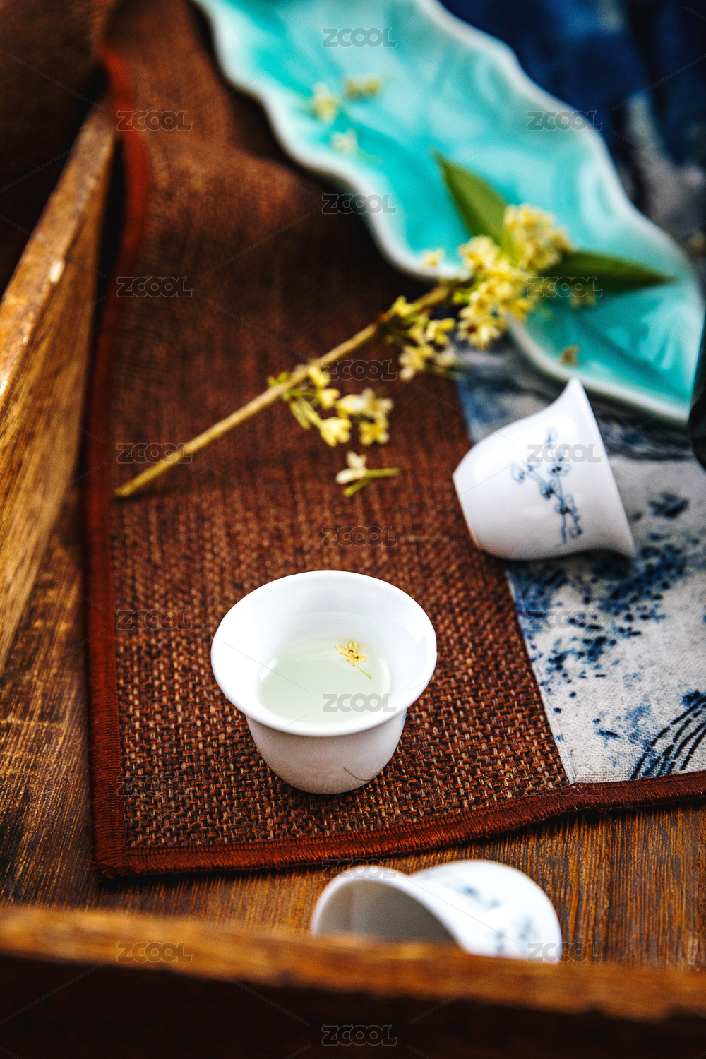 青瓷杯泡绿茶配竹制器具的中式场景