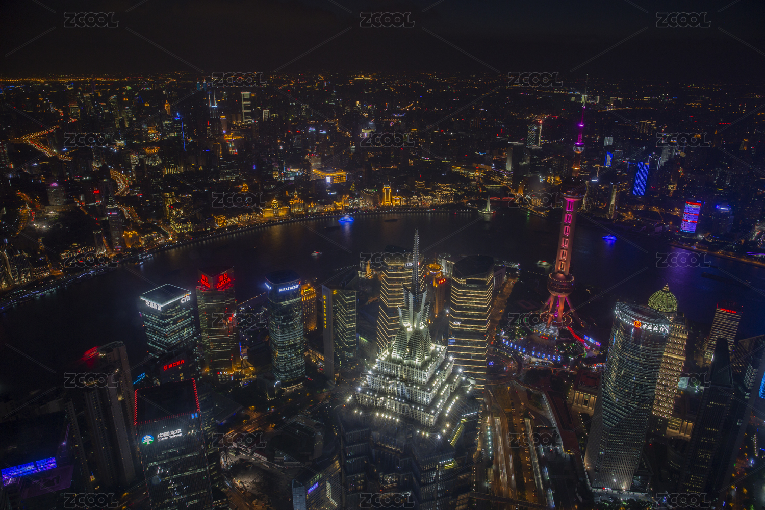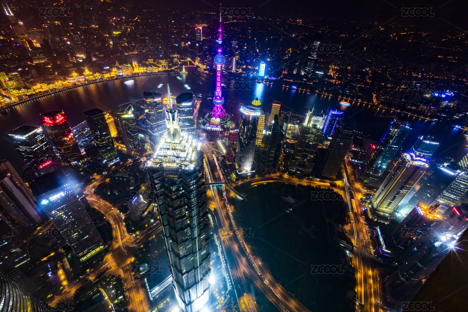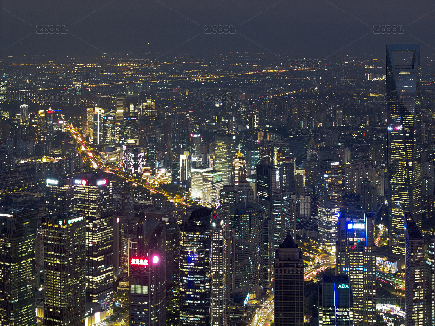 俯瞰航拍中国上海浦东陆家嘴CBD建筑群夜