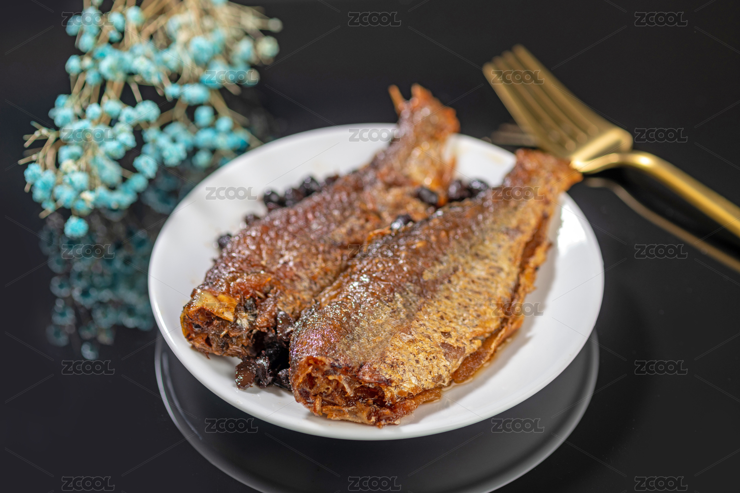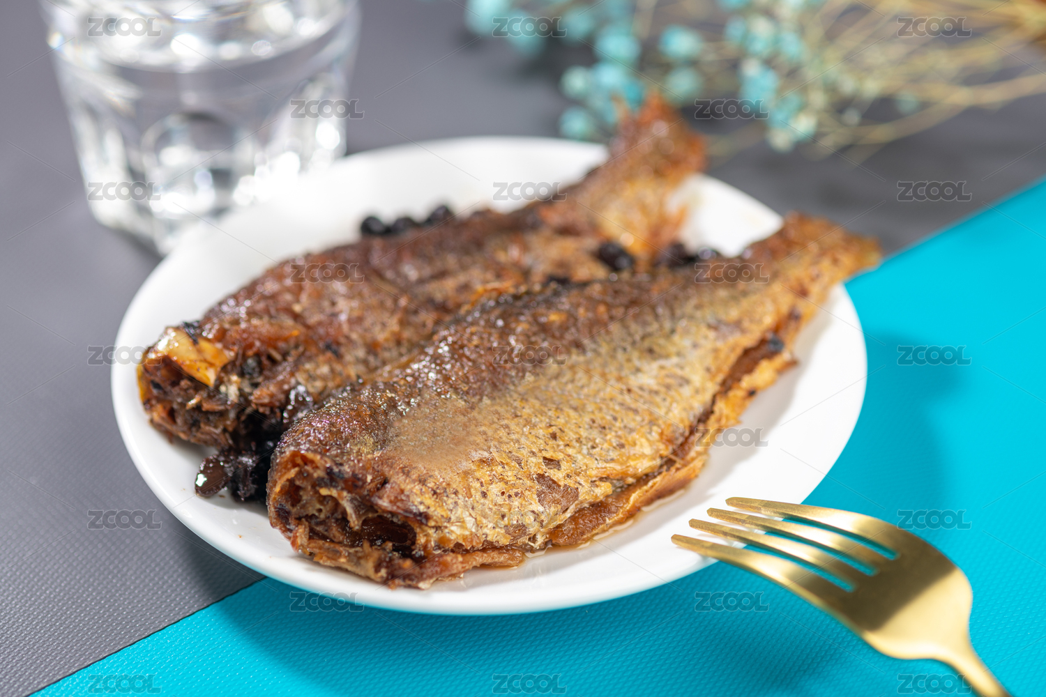 熬鱼红烧鱼棚拍特写蓝灰莫兰迪色系背景