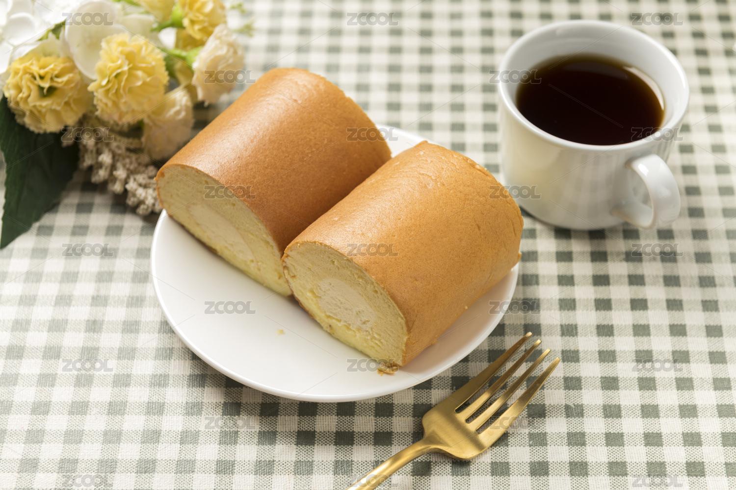 一盘鲜牛乳蛋糕卷摆放在桌面上特写